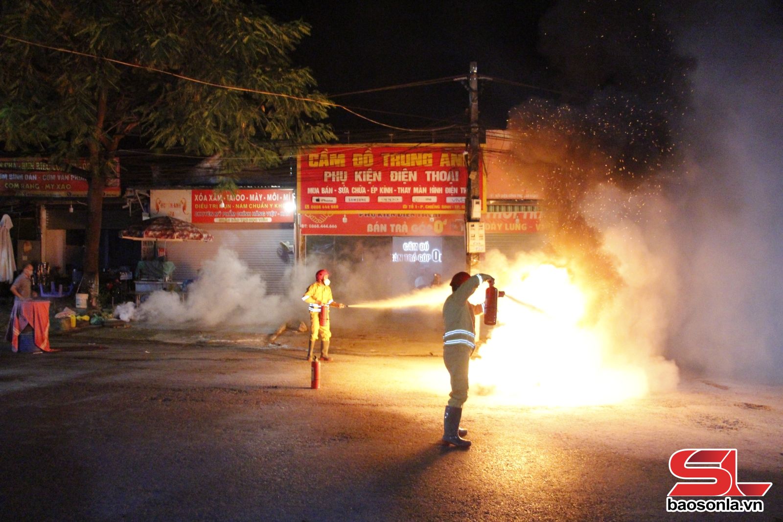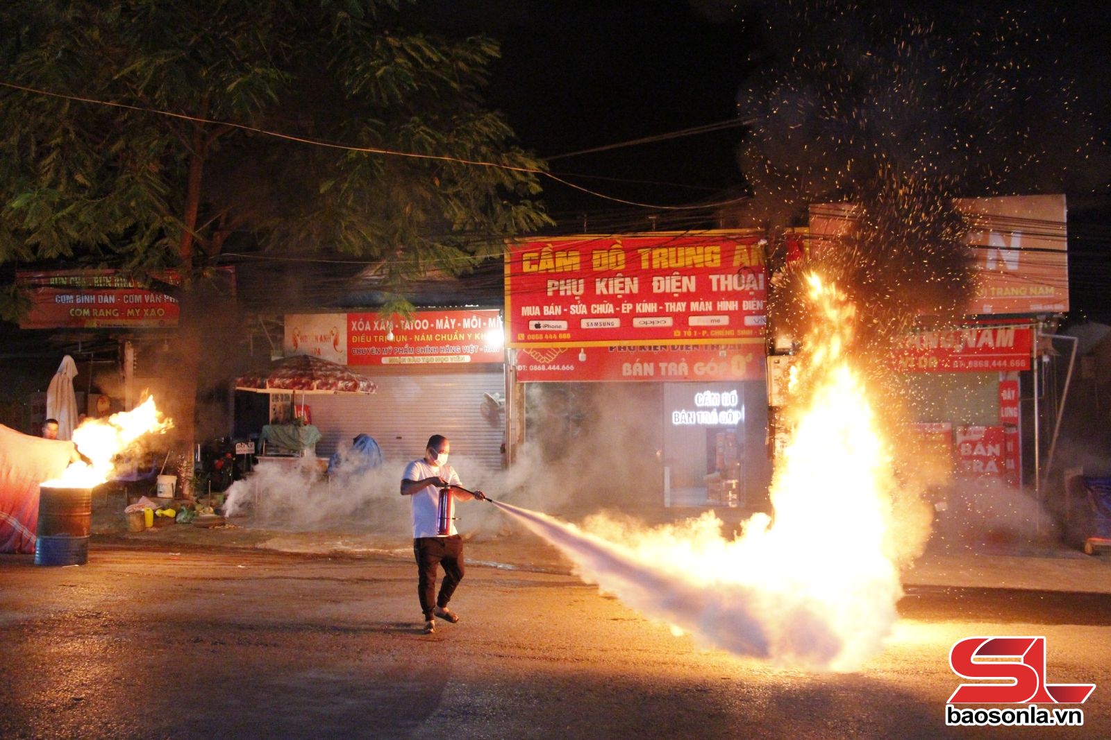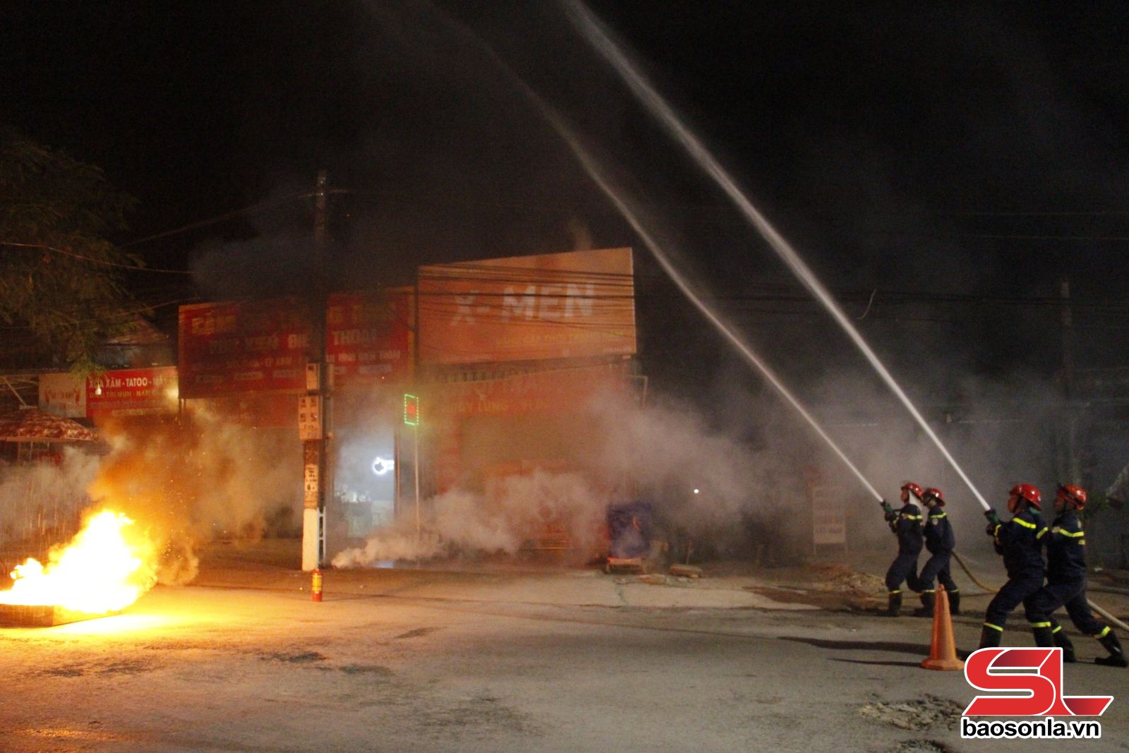 Với tình huống giả định, 19 giờ 30 phút, xảy ra cháy tại cửa hàng cầm đồ, phụ kiện điện thoại tại tổ 1, phường Chiềng Sinh. Do sự cố chập điện gây cháy, ngọn lửa nhanh chóng phát triển và lan sang hàng hóa xung quanh, nếu như không chữa cháy kịp thời sẽ lan toàn bộ khu dân cư gây cháy lớn. Khi xảy ra cháy, gia đình đã hô hoán và nhanh chóng nhấn nút ấn báo cháy của Tổ liên gia để báo động. Tổ liên gia đã nhanh chóng huy động lực lượng sử dụng phương tiện chữa cháy để dập tắt đám cháy, cứu người, di chuyển tài sản ra bên ngoài và báo cho chính quyền địa phương và lực lượng Cảnh sát PCCC và CNCH.