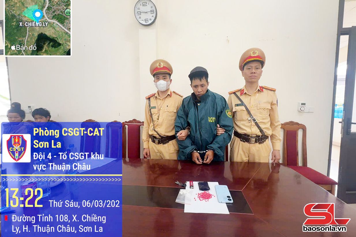 Theo đó, vào hồi 21 giờ 5 phút, ngày 5/3, Tổ Cảnh sát giao thông khu vực Thuận Châu thực hiện nhiệm vụ tuần tra kiểm soát, xử lý vi phạm về trật tự an toàn giao thông (TTATGT) tại km 334+700m quốc lộ 6, thuộc địa phận tiểu khu 10, xã Thuận Châu, đã phát hiện đối tượng Phạm Minh Đức, sinh năm 1988, trú tại bản Phiêng Bông, xã Muổi Nọi, điều khiển xe mô tô biển số 26K1-126.65 có hành vi tàng trữ trái phép chất ma túy. Tang vật thu giữ được gồm 10,28 gam heroin, 190 viên ma túy tổng hợp có trọng lượng 20,19 gam, 1 xe mô tô.
