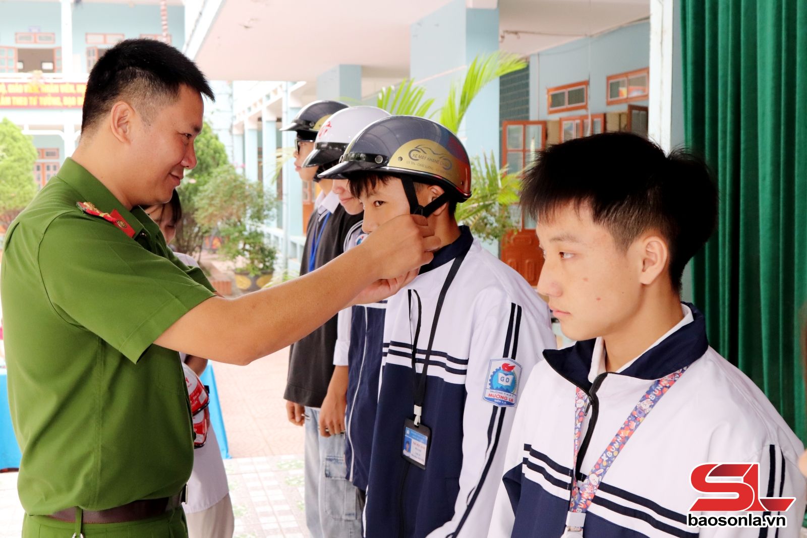 Tại các địa điểm tuyên truyền, cán bộ, chiến sĩ Phòng CSGT Công an tỉnh và Công an xã Mường La đã tặng mũ bảo hiểm đạt chuẩn cho 40 học sinh và người dân.