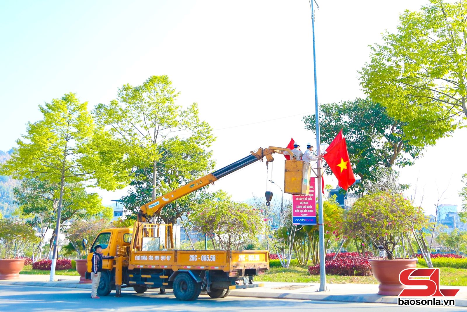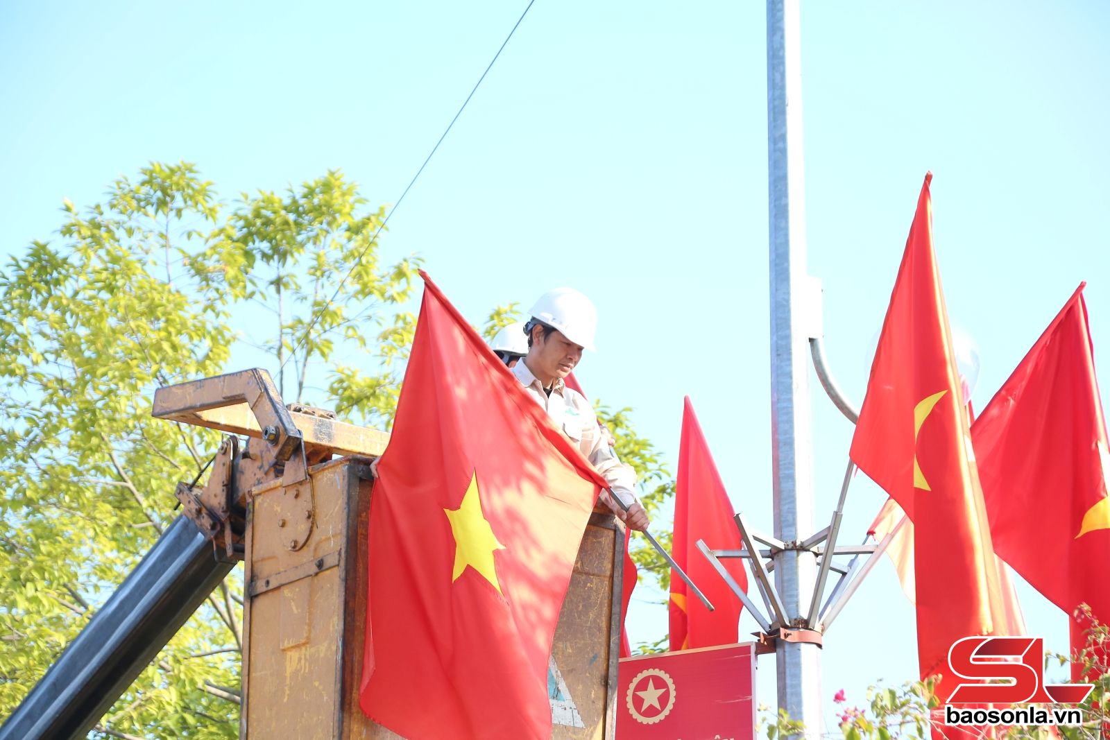 Cùng với đó, Công ty CP Môi trường và Dịch vụ đô thị Sơn La treo hơn 1.000 lá cờ các loại dọc các tuyến đường trung tâm; bố trí 20 bát cờ Hồng kỳ tại các nút giao thông và khu vực Quảng trường Tây Bắc; đầu tư thay thế hệ thống chiếu sáng, điện trang trí trên 100% tuyến phố; chăm sóc, cắt tỉa cây xanh, ly hoa. Ngoài ra, 100% cơ quan, đơn vị treo băng rôn, áp phích, bảng điện tử, màn hình Led tại trụ sở làm việc; tổng vệ sinh khuôn viên; nhà văn hóa tổ, bản, tiểu khu và các hộ gia đình đồng loạt treo cờ Tổ quốc...