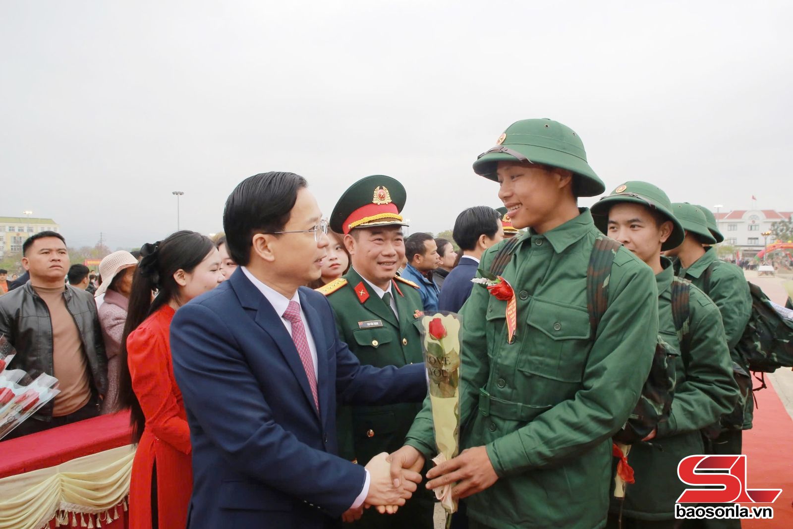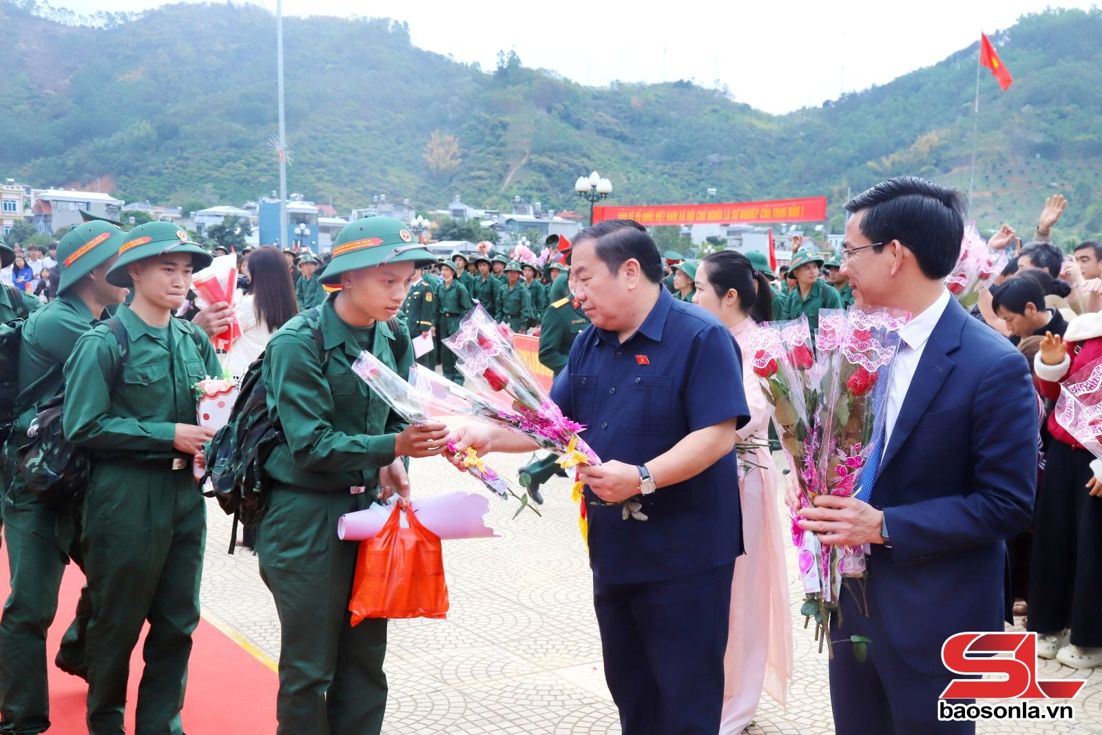 Lãnh đạo các xã, phường và các tân binh dự lễ dâng hoa Tượng đài Bác hồ với đồng bào các dân tộc Tây Bắc.Các tân binh dâng hoa Tượng đài Bác Hồ với đồng bào các dân tộc Tây Bắc.Lễ giao nhận quân tại Quảng trường 8/5, phường Mộc Châu.Thiếu tướng Trần Văn Bắc, Tư lệnh Quân khu 2, tặng hoa, động viên tân binh. Đồng chí Bí thư Tỉnh ủy tặng hoa, động viên tân binh. Đồng chí Phó Bí thư Thường trực Tỉnh ủy tặng hoa, động viên tân binh. Đồng chí Phó Bí thư Tỉnh ủy, Chủ tịch UBND tỉnh tặng hoa, động viên tân binh. Đồng chí Phó Bí thư Tỉnh ủy, Chủ tịch Ủy ban MTTQ Việt Nam tỉnh tặng hoa chúc mừng tân binh lên đường nhập ngũ. Các tân binh bước qua cổng vinh quang trước khi lên đường về đơn vị.Các tân binh hăng hái lên đường nhập ngũNgười thân tiễn tân binh lên đường nhập ngũ.Gia đình động viên tân binh trước khi lên đường nhập ngũ. Người thân động viên tân binh lên đường nhập ngũ.Các tân binh hăng hái lên đường về đơn vịĐông đảo nhân dân đến dự và động viên các tân binh lên đường nhập ngũ.