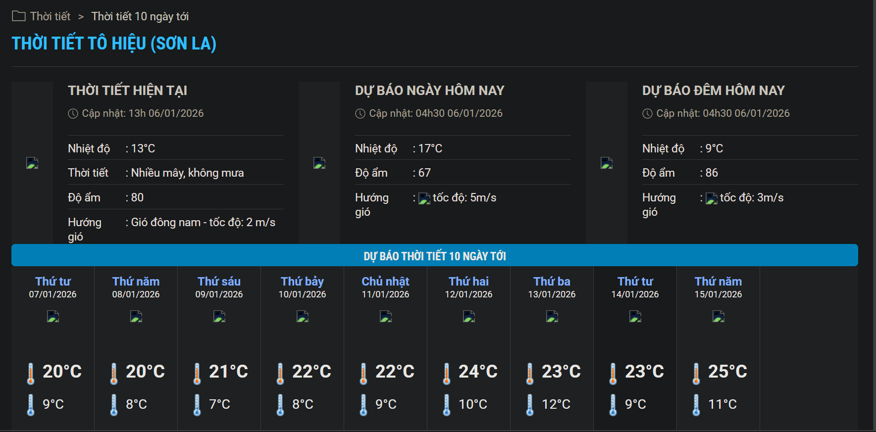 Theo thông tin từ Đài Khí tượng Thủy văn tỉnh Sơn La, do ảnh hưởng của không khí lạnh tăng cường mạnh, ngày và đêm 6/1, thời tiết tỉnh Sơn La nhiều mây, có mưa nhỏ vài nơi, trời rét đậm, rét hại trên diện rộng. Theo Đài Khí tượng Thủy văn Bắc Bộ, nhiệt độ thấp nhất phổ biến từ 8-10°C, vùng núi cao từ 6-8°C, có nơi thấp hơn.