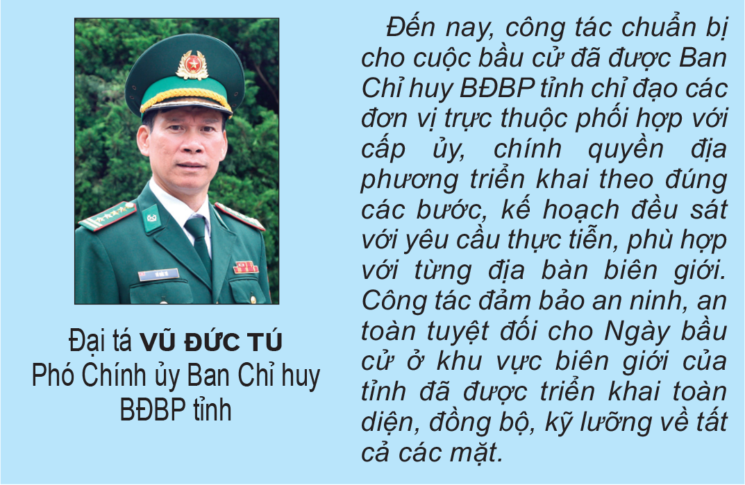 Ban Chỉ huy BĐBP tỉnh đã xây dựng kế hoạch sẵn sàng chiến đấu bảo vệ bầu cử; phối hợp, hiệp đồng với các đơn vị, cơ quan chức năng, địa phương trong việc xây dựng, triển khai các phương án, kế hoạch bảo vệ biên giới; xây dựng phương án bảo vệ các mục tiêu, công trình trọng điểm, các trụ sở cơ quan Đảng, chính quyền, các tổ bầu cử, địa điểm bỏ phiếu, nơi niêm yết danh sách cử tri. Các đồn biên phòng đã phối hợp cùng chính quyền địa phương tổ chức niêm yết danh sách cử tri, kiểm tra cơ sở vật chất phục vụ bầu cử, đồng thời tuyên truyền, vận động nhân dân nâng cao ý thức trách nhiệm, tích cực tham gia bầu cử.