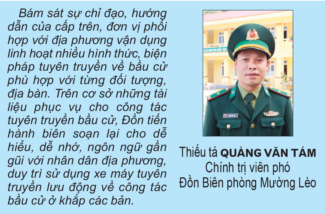 Các đơn vị đã lựa chọn những cán bộ vận động quần chúng am hiểu địa bàn, có kinh nghiệm về công tác vận động quần chúng, chủ động xuống cơ sở thực hiện “4 cùng” để tuyên truyền một cách dễ hiểu, dễ nhớ cho bà con về các quy định liên quan đến bầu cử. Đồng thời, phát huy vai trò của các đảng viên đồn biên phòng khi tham gia sinh hoạt tại các chi bộ các bản và phụ trách các hộ gia đình ở khu vực biên giới để tuyên truyền cho nhân dân hiểu và thực hiện tốt các nội dung liên quan đến cuộc bầu cử. Từ đầu năm đến nay, các đơn vị đã tổ chức 65 buổi tuyên truyền về bầu cử cho trên 10.000 lượt người dân tại các bản vùng cao biên giới; tuyên truyền lưu động được 41 lượt với thời lượng 82 giờ.