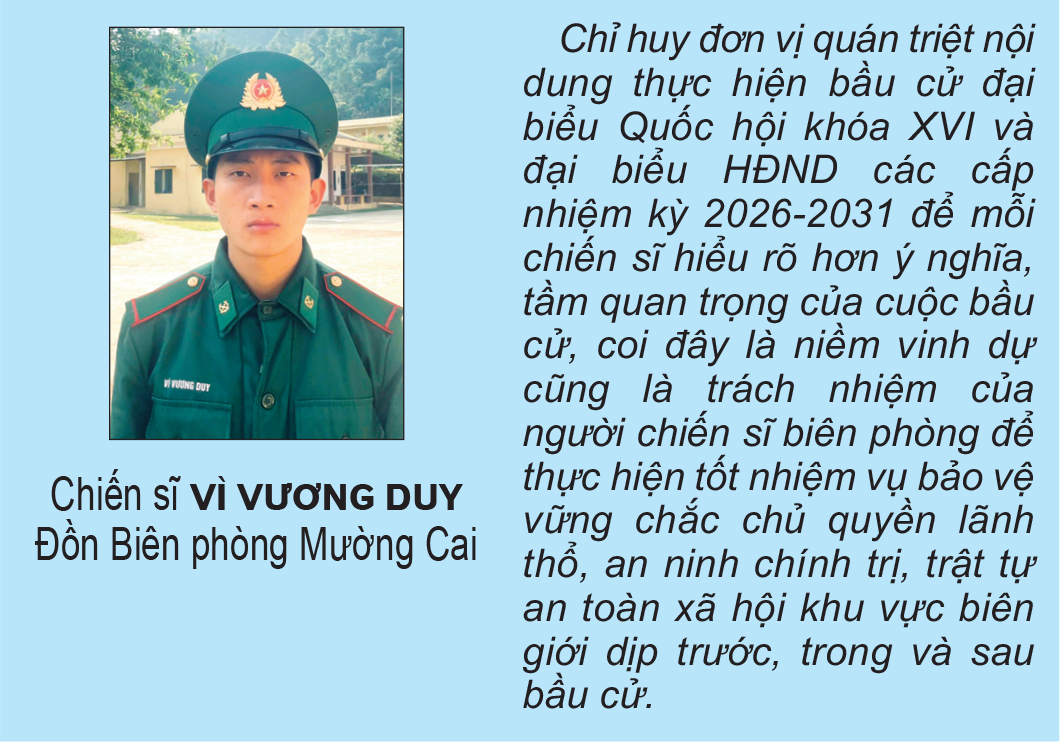 Thời điểm này, dọc tuyến biên giới, hình ảnh người lính quân hàm xanh cùng cấp ủy, chính quyền cơ sở chuẩn bị cho bầu cử đã tạo nên niềm tin và khí thế phấn khởi trong nhân dân. Tin tưởng rằng với sự chủ động, trách nhiệm của lực lượng BĐBP tỉnh sẽ góp phần quan trọng để cuộc bầu cử đại biểu Quốc hội khóa XVI và đại biểu HĐND các cấp nhiệm kỳ 2026 - 2031 diễn ra an toàn, đúng luật, thành công tốt đẹp, thực sự trở thành ngày hội của toàn dân.