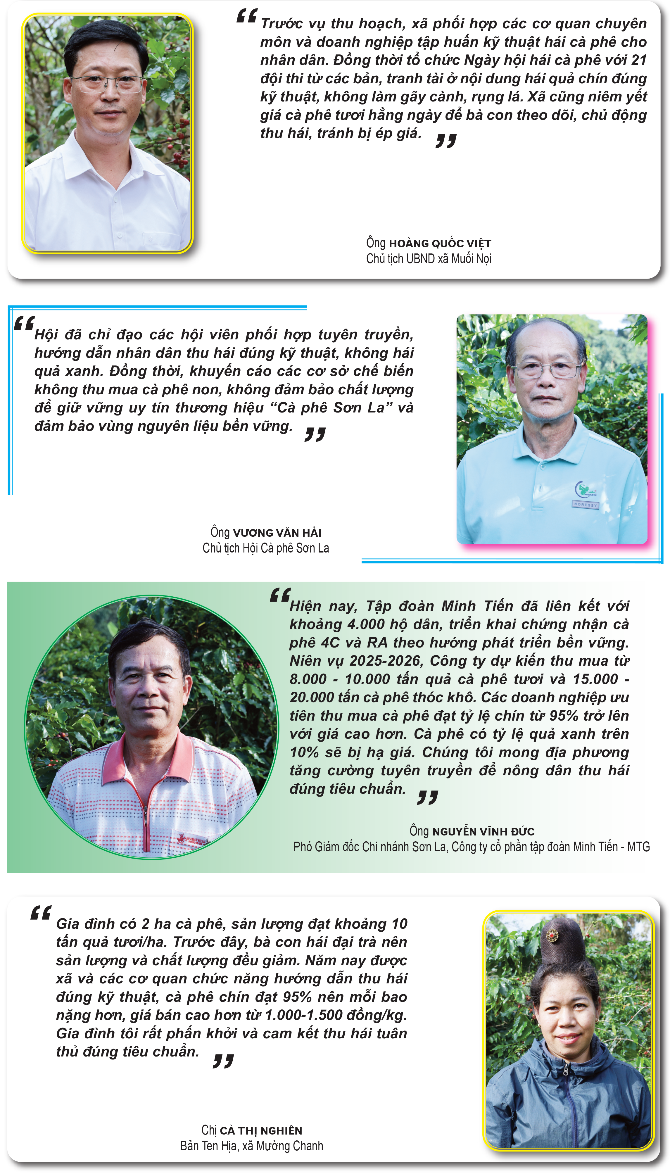 UBND các xã, phường hướng dẫn, chỉ đạo doanh nghiệp, hợp tác xã và nhân dân thu hái, chế biến cà phê đúng tiêu chuẩn; công khai danh sách tổ chức, cá nhân thu mua quả xanh làm giảm chất lượng, ảnh hưởng thương hiệu “Cà phê Sơn La”. Trưởng bản chịu trách nhiệm kiểm tra, giám sát việc thu hái cà phê xanh, non không đúng quy định. Yêu cầu các tổ chức, cá nhân thu mua, sơ chế, chế biến cà phê trên địa bàn thu mua quả cà phê đạt tiêu chuẩn, đảm bảo chất lượng chế biến; cam kết không thu mua quả non, quả kém chất lượng nhằm hạn chế tình trạng nhân dân hái cà phê xanh.
