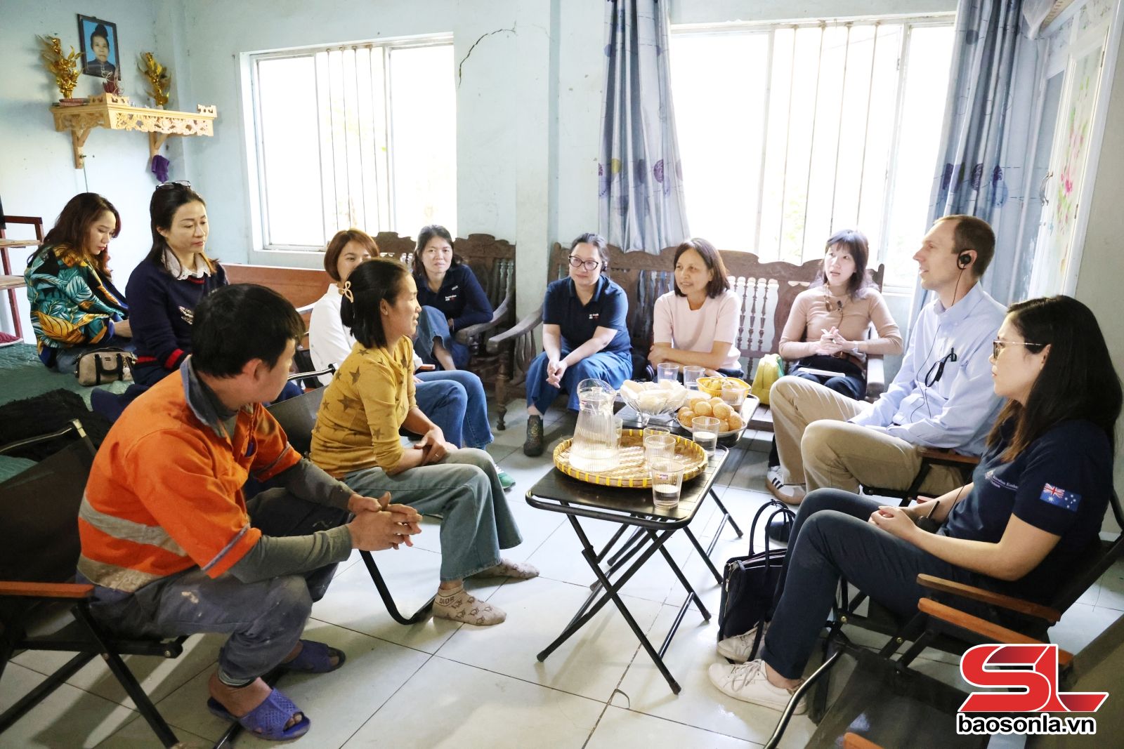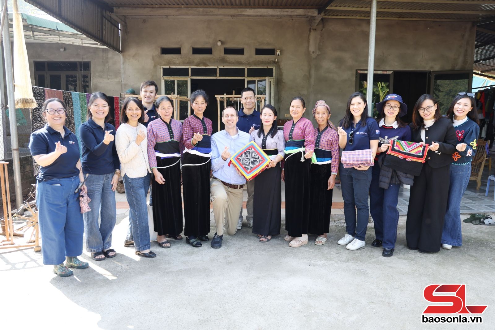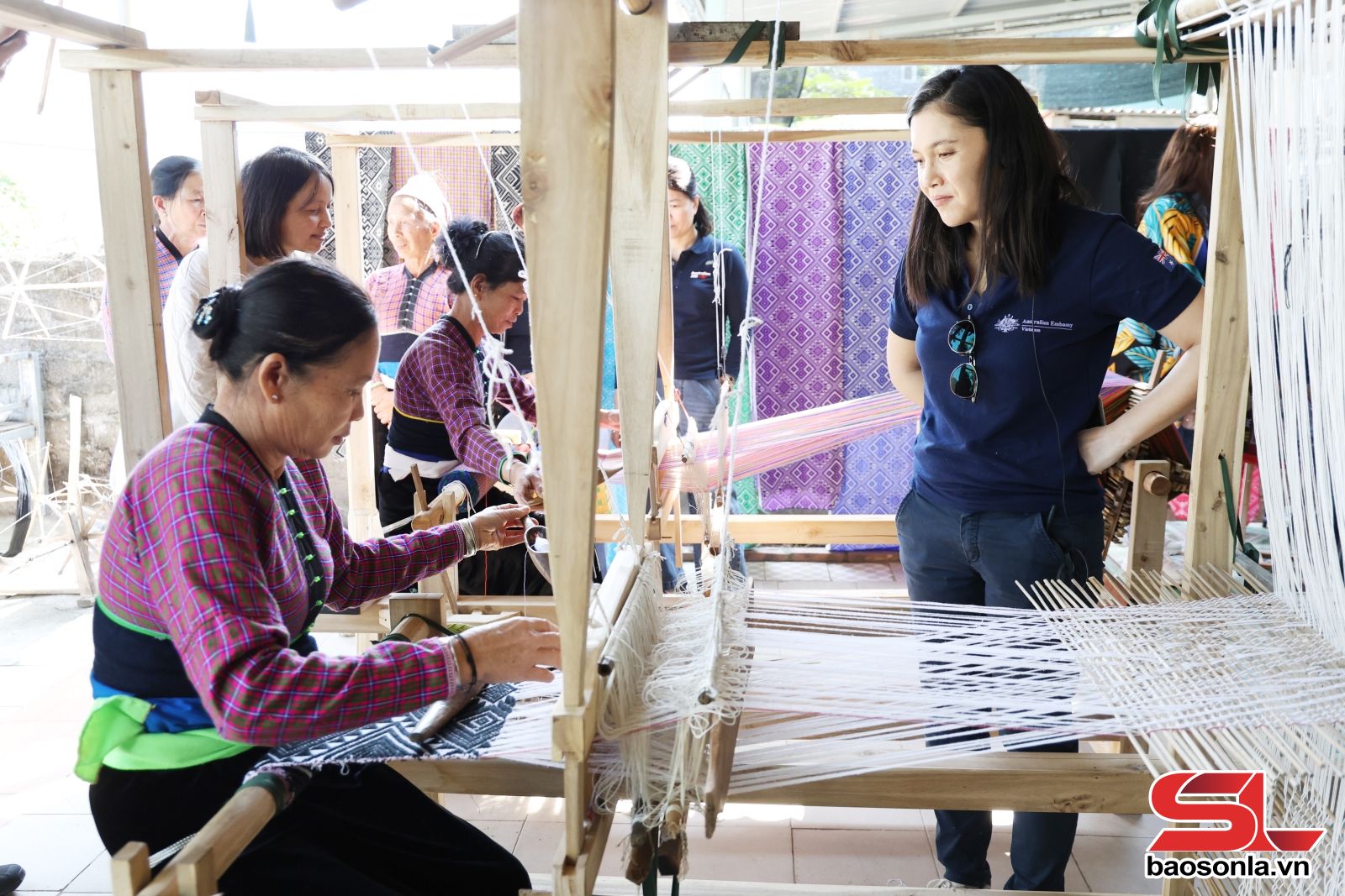 Tại xã Tường Hạ, Đoàn Đại sứ quán Australia tại Việt Nam đã thăm và trao đổi với chị Hà Thị Thảo, đại diện Hợp tác xã Thảo dược dân tộc và dịch vụ du lịch cộng đồng bản Khảo, là đối tượng hưởng lợi của tiểu dự án “Thúc đẩy kinh doanh và lãnh đạo cho doanh nhân nữ tại Sơn La”, đồng thời là đại diện Tổ hợp tác Dệt thổ cẩm bản Khảo, thuộc nhóm đối tượng hưởng lợi của tiểu dự án “Hỗ trợ kỹ thuật tăng cường hệ sinh thái chuyển đổi số bao trùm cho doanh nghiệp vừa, nhỏ và siêu nhỏ tại tỉnh Sơn La”.
