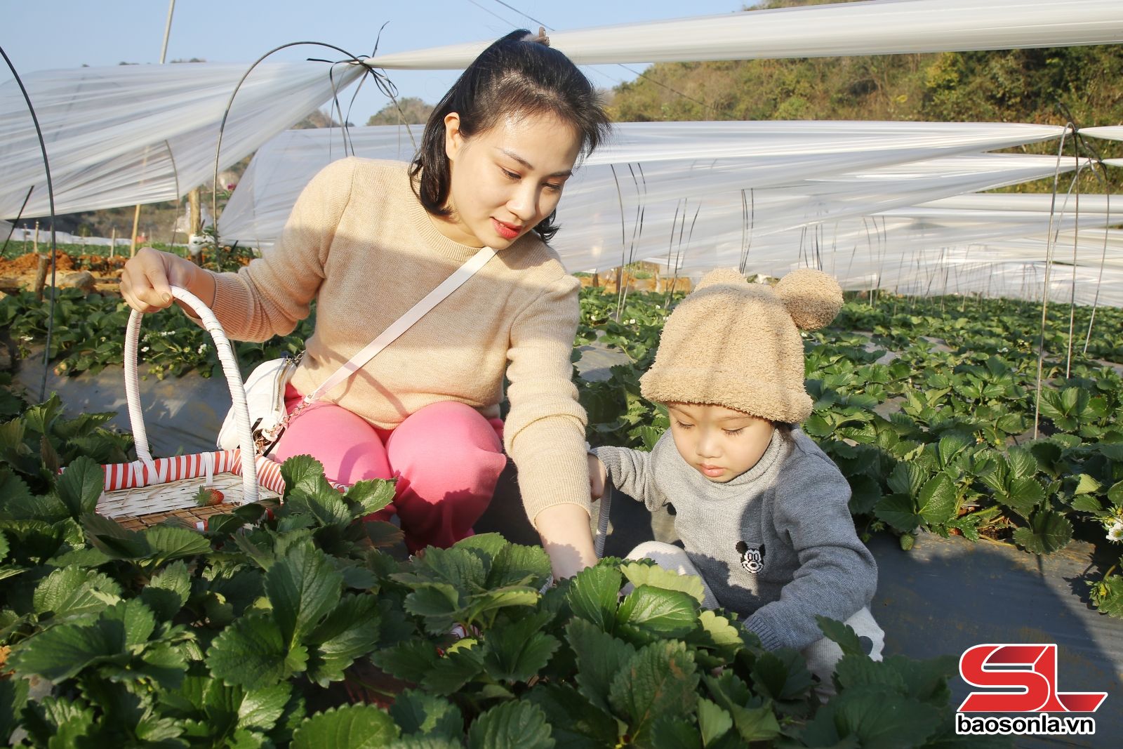 Mùa này, cao nguyên Mộc Châu còn thu hút du khách bởi những đồi chè xanh tươi, vươn búp non mơn mởn, căng tràn sức sống; cánh đồng hoa cải đang đua nhau khoe sắc; vườn cam vàng óng sai trĩu quả, hay tận tay hái những trái dâu tây chín mọng. Cùng gia đình đến trải nghiệm tại HTX Hoa Mộc Châu, chị Trần Thu Thủy, thành phố Hà Nội, chia sẻ: Được tự mình hái dâu, nếm thử hương vị của dâu tây tươi ngon vừa thu hoạch, cho chúng tôi trải nghiệm rất thú vị. Tôi đã chọn hái những quả to, đẹp nhất để mang về làm quà cho người thân trong gia đình cùng thưởng thức.