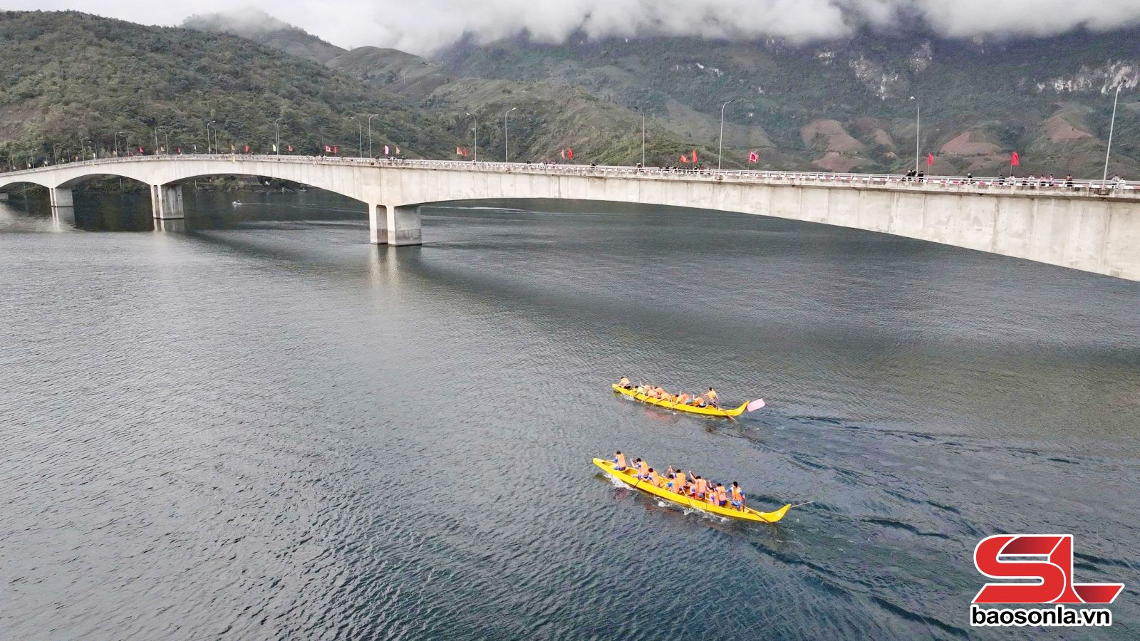 Dọc hai bên bờ sông và trên cầu Pá Uôn, hàng nghìn khán giả reo hò, cổ vũ nhiệt tình cùng tiếng trống, tiếng chiêng rộn rã, tạo nên một không khí náo nhiệt, tràn đầy sức sống của ngày hội vùng sông nước.