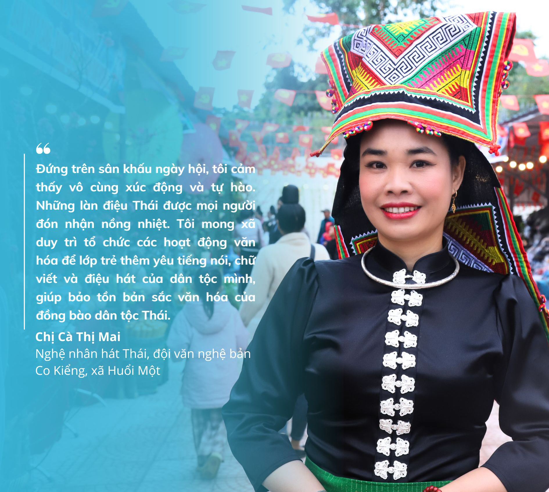 Ngày hội được mở màn với phần công diễn 11 tiết mục văn nghệ xuất sắc nhất được tuyển chọn từ hội thi trước đó. Các tác phẩm tập trung ca ngợi Đảng quang vinh, Bác Hồ kính yêu, tình yêu quê hương đất nước, tôn vinh giá trị truyền thống qua những làn điệu hát Thái và các điệu xòe Thái cổ đậm đà bản sắc. Đan xen các tiết mục văn nghệ là màn trình diễn trang phục các dân tộc; những giá trị truyền thống và nét hoa văn tinh xảo được các thí sinh khéo léo phô diễn theo từng bước đi, điệu nhạc.