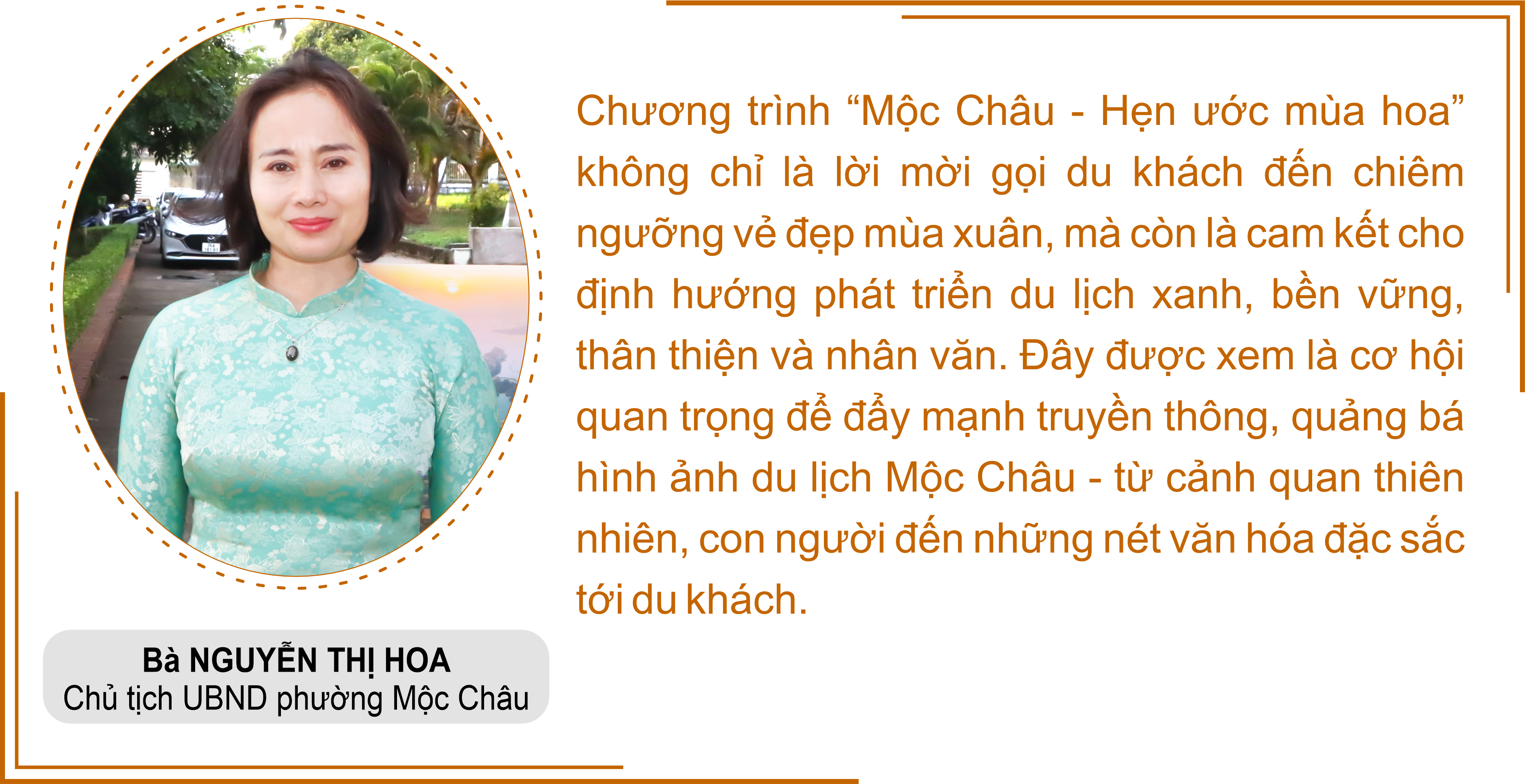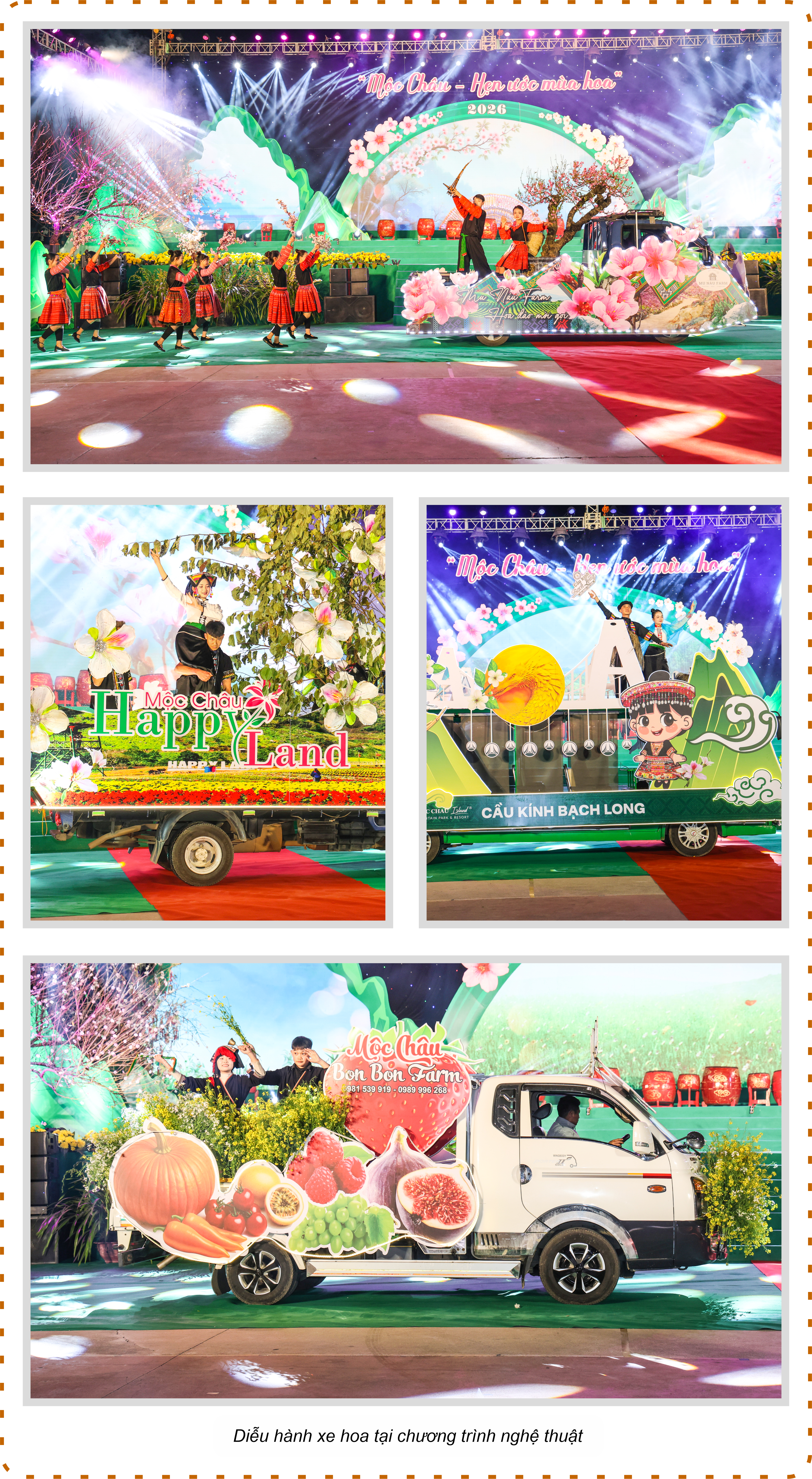 Phần diễu hành xe hoa đường phố tăng thêm phần hấp dẫn khi có sự góp mặt trình diễn của top 10 hoa hậu các dân tộc Việt Nam trong tà áo dài thướt tha. Trên tay các hoa hậu là những bông sen - quốc hoa của Việt Nam, biểu tượng của nhan sắc, là những sứ giả hòa bình, thân thiện, mang vẻ đẹp của Mộc Châu lan tỏa đến khắp năm châu, bốn biển. Sự hiện diện của các hoa hậu tại lễ hội khẳng định vị thế và sức hút của Mộc Châu.