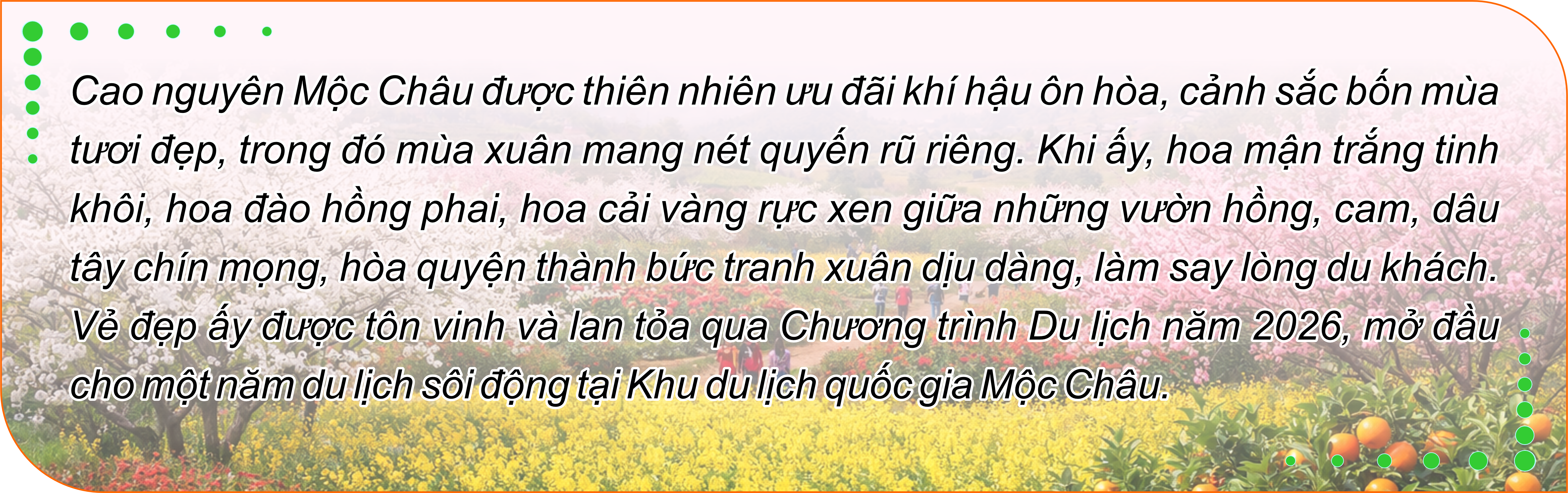 Tôn vinh vẻ đẹp thiên nhiên bốn mùa, những giá trị văn hóa đặc sắc của cộng đồng các dân tộc anh em và quảng bá hình ảnh Mộc Châu - Khu du lịch Quốc gia, phường Mộc Châu tổ chức Năm du lịch 2026 với chủ đề “Hẹn ước mùa hoa”, thu hút đông đảo du khách bằng chuỗi hoạt động, như: Chương trình nghệ thuật đặc sắc, không gian triển lãm giới thiệu các điểm du lịch, cuộc thi ảnh, trải nghiệm du lịch thông minh qua mã QR...
