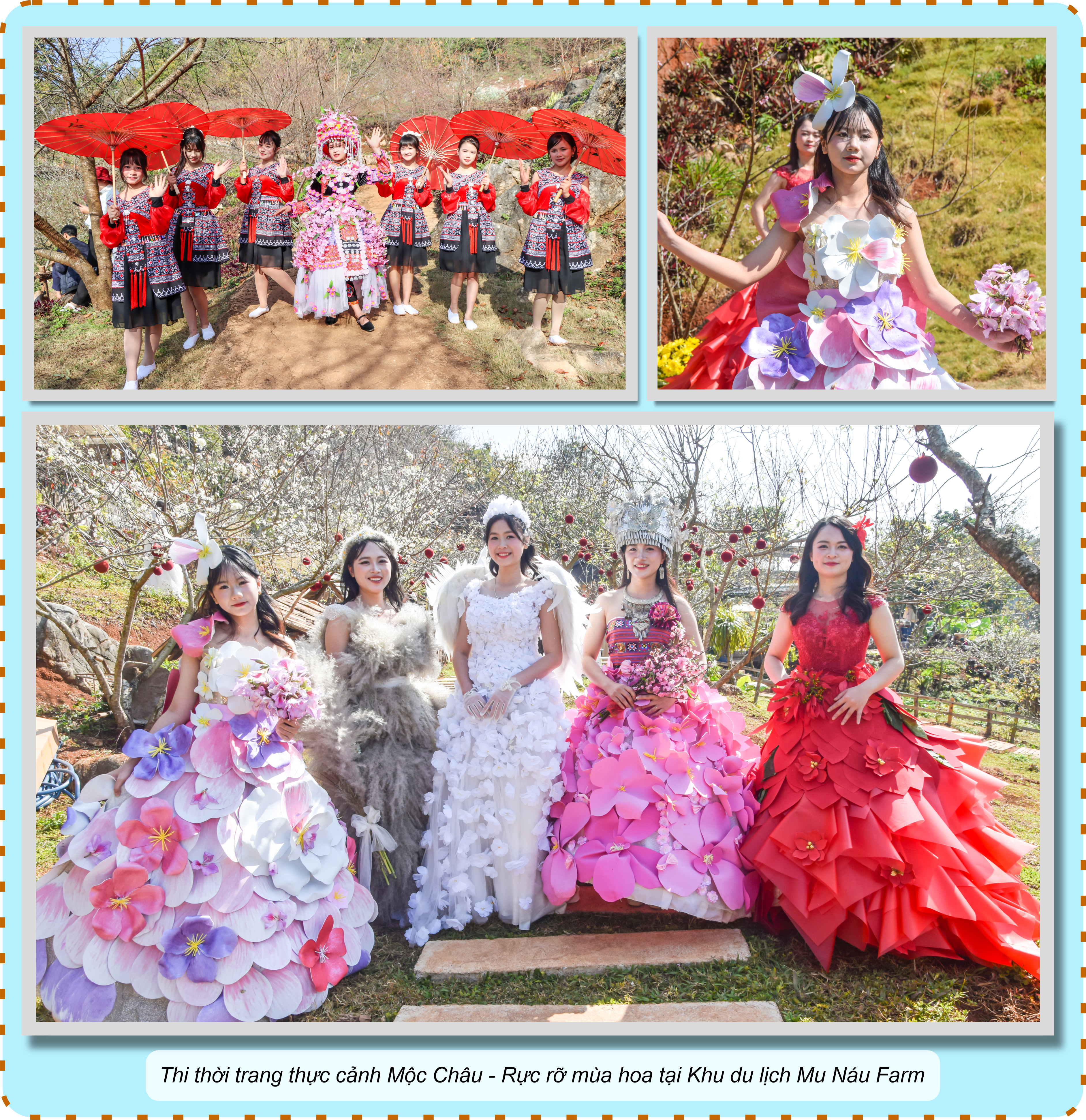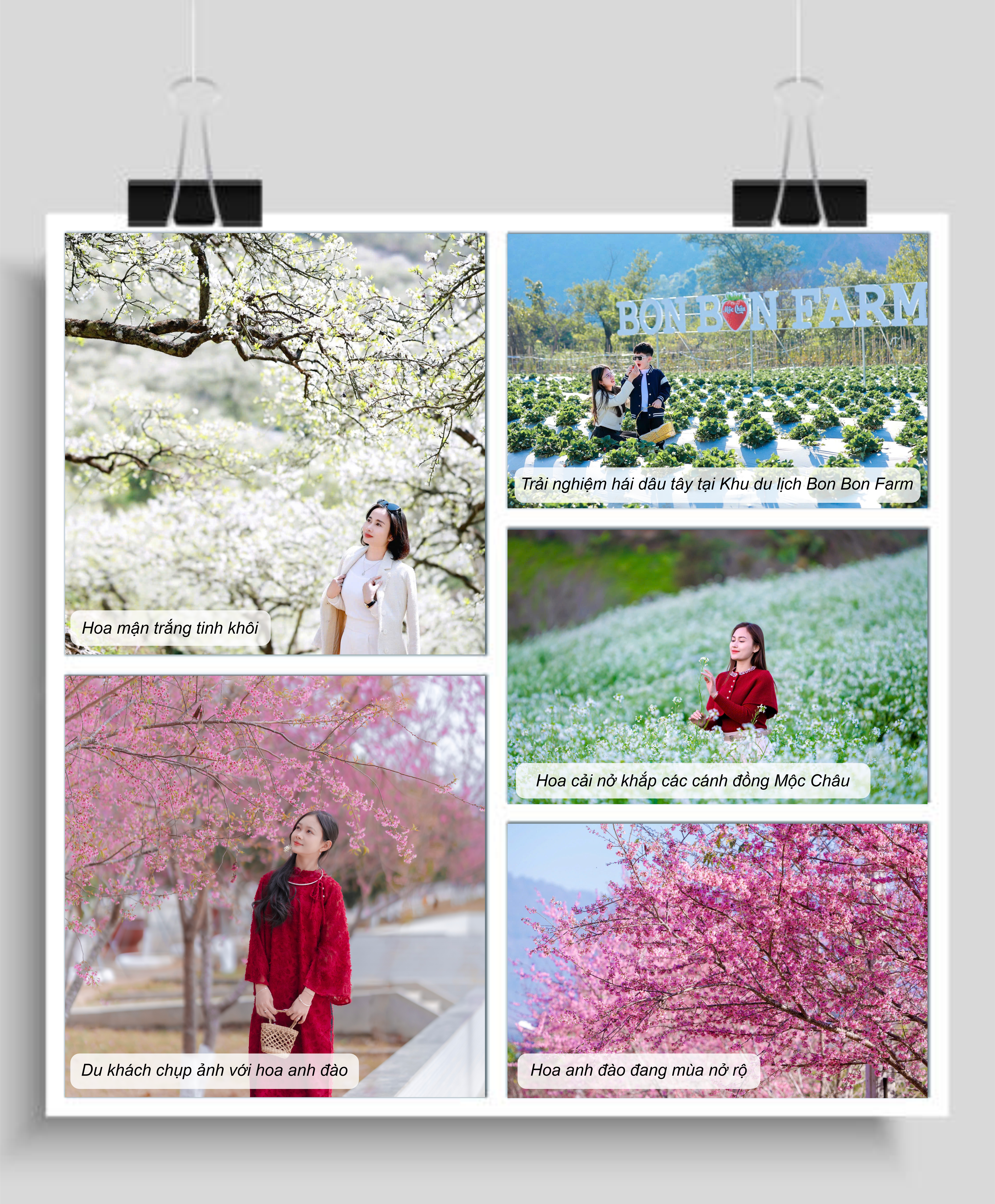 Từng loại hoa đặc trưng trên cao nguyên Mộc Châu như đào, mận, ban, cải, dã quỳ đến các loại quả như dâu tây, cam, hồng… đều được sáng tạo thành các mô hình nghệ thuật, gắn với sự phát triển của các doanh nghiệp, HTX, điểm du lịch, như Hoa đào mời gọi - Khu du lịch Mu Náu Farm; Hoa mận tinh khôi - Thung lũng hoa 82; Hoa ban e ấp - Happy Land Mộc Châu; Hoa lan quý phái - Thác Dải Yếm Ecofarm; Hoa mát nhớ nhung - Khu du lịch Cầu kính Bạch Long...