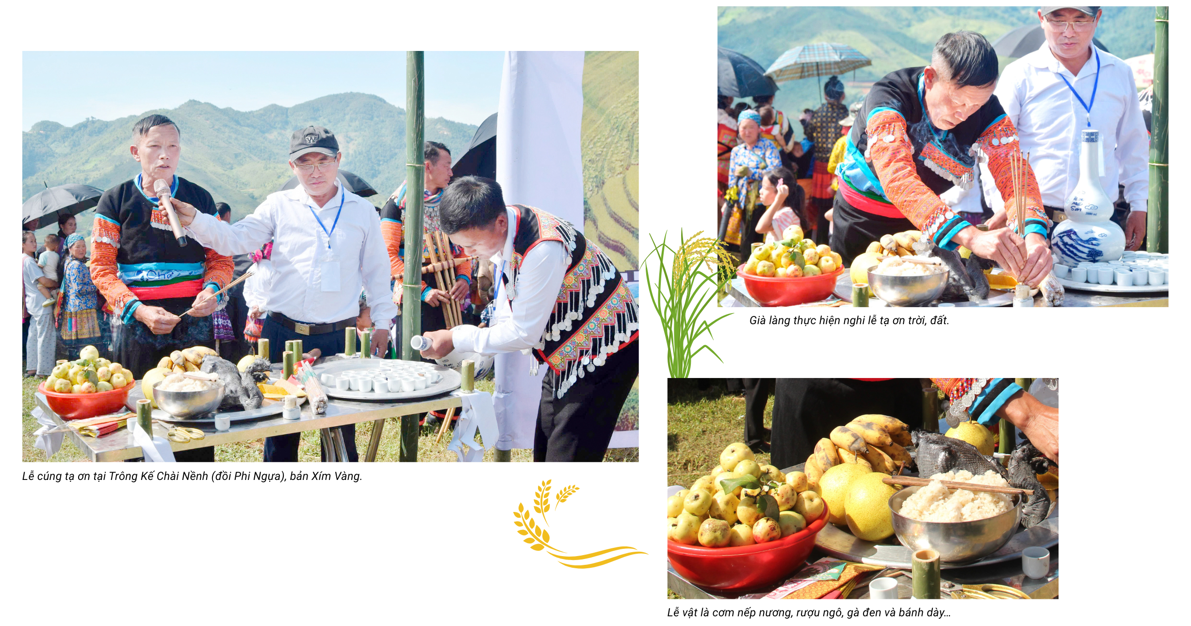 Lễ hội Mùa vàng diễn ra 2 phần: Mở đầu là nghi lễ tạ ơn do già làng chủ trì tại ruộng lúa, với lễ vật là nếp nương, rượu ngô, gà đen và bánh dày… là những sản vật gắn bó trong đời sống người Mông, bày tỏ lòng biết ơn của nhân dân trong xã tạ ơn trời đất, tổ tiên cho mưa thuận, gió hòa sau một mùa vụ bội thu.