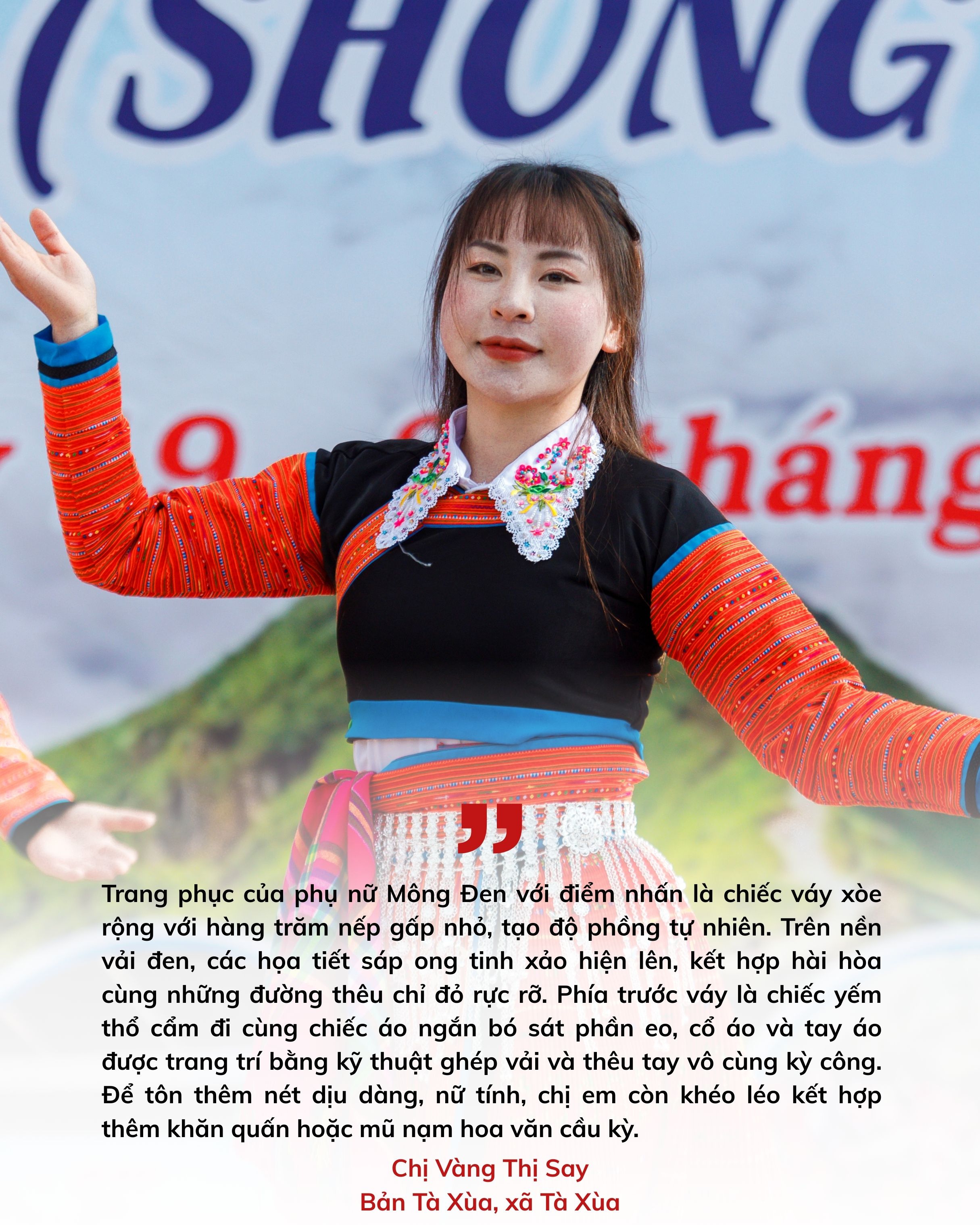 Những ngày đầu năm mới, lên thăm xã Tà Xùa, trong không gian rộn ràng của tiếng khèn gọi bạn và các trò chơi dân gian náo nhiệt, hình ảnh những thiếu nữ Mông Đu (Mông Đen) trong bộ trang phục truyền thống duyên dáng đã trở thành tâm điểm thu hút mọi ánh nhìn. Dù cuộc sống hiện đại có nhiều đổi thay, đồng bào nơi đây vẫn giữ vẹn nguyên những nét đặc trưng trên trang phục, với sắc đen là gam màu nền cho hoa văn có màu đỏ chủ đạo, tạo nên vẻ đẹp rực rỡ như hoa rừng.