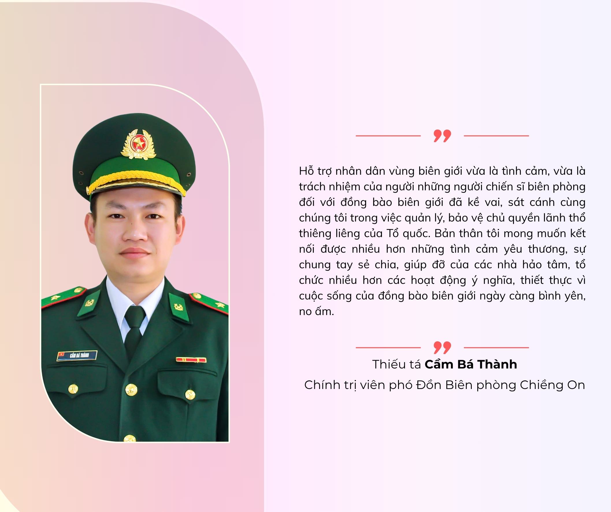 Thiếu tá Cầm Bá Thành chia sẻ: Gắn bó với đồng bào nơi biên cương, chúng tôi luôn tâm niệm và xác định rằng: Chính đồng bào ở khu vực biên giới là chủ thể của sự nghiệp bảo vệ biên giới quốc gia, giữ vững toàn vẹn lãnh thổ của Tổ quốc, mỗi người dân là một “Cột mốc sống”. Bởi vậy, không chỉ riêng tôi mà mỗi người lính mang quân hàm xanh cùng với cấp ủy, chính quyền các cấp luôn dành sự quan tâm đặc biệt đối với đồng bào nơi biên cương thân yêu của Tổ quốc.
