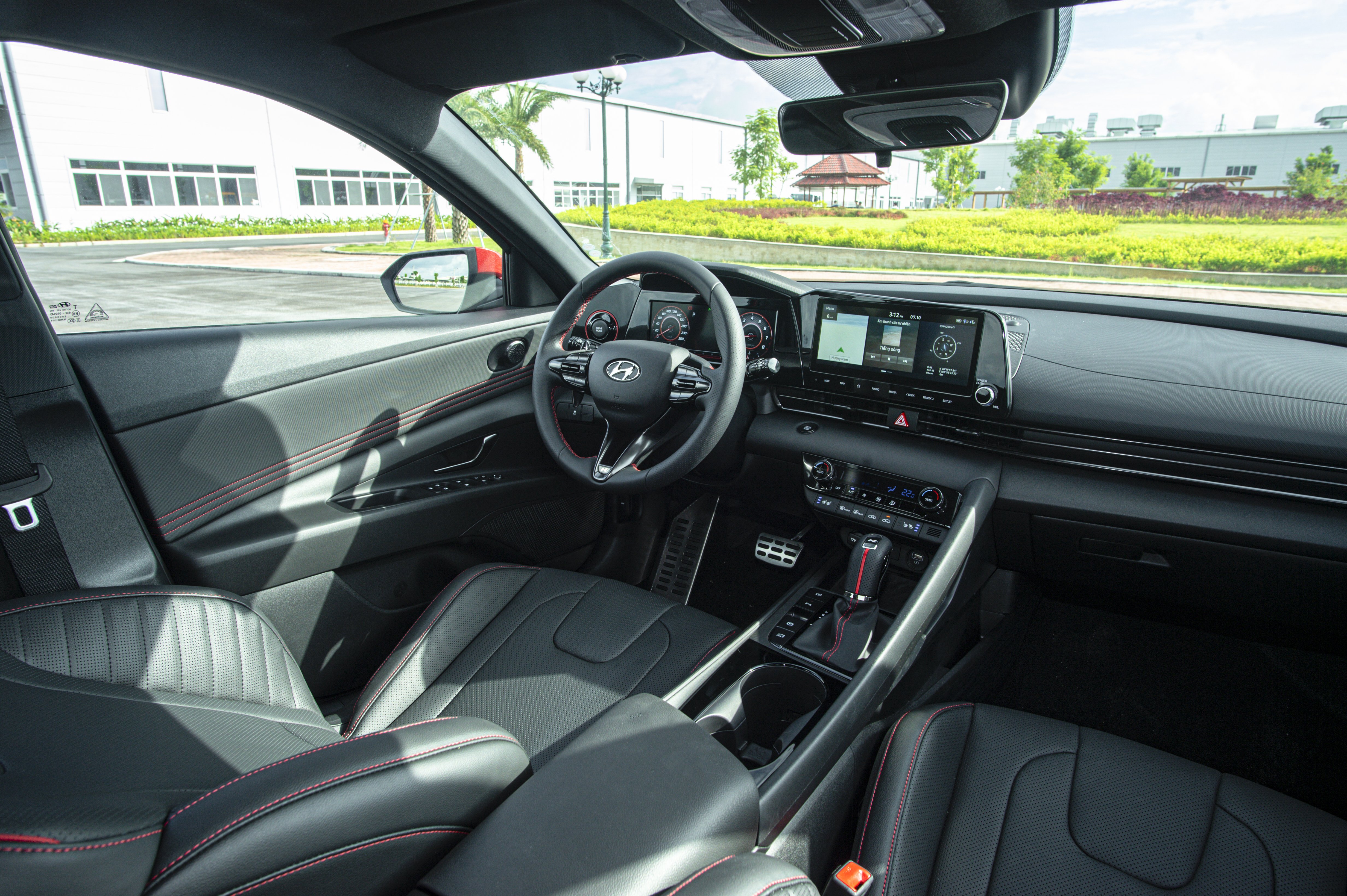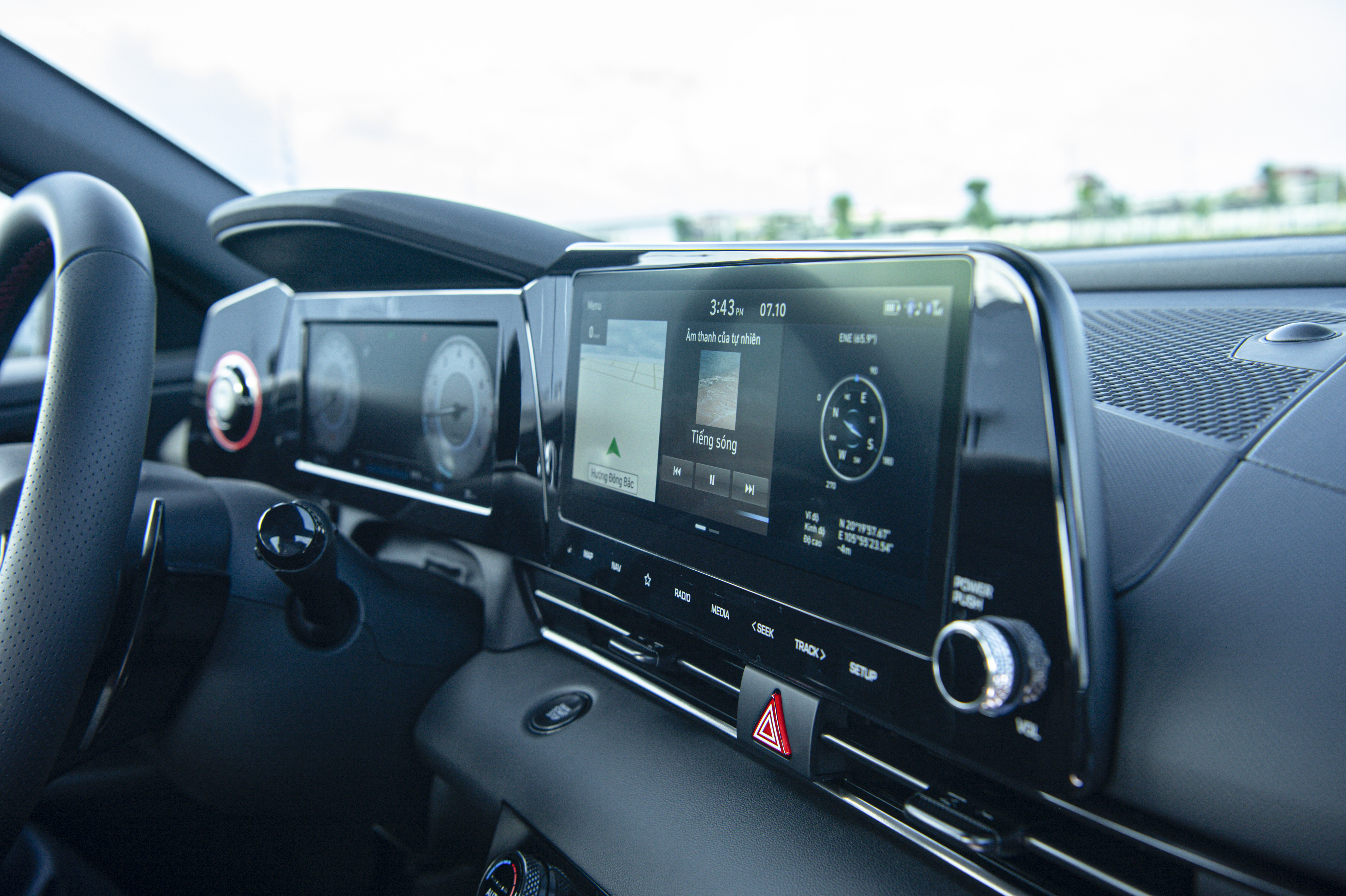 Bước vào bên trong, Hyundai Elantra 2025 mở ra một không gian đậm chất công nghệ với cụm màn hình đôi 10.25 inch nối liền, thiết kế buồng lái ôm sát người lái mang lại cảm giác thể thao và hiện đại.