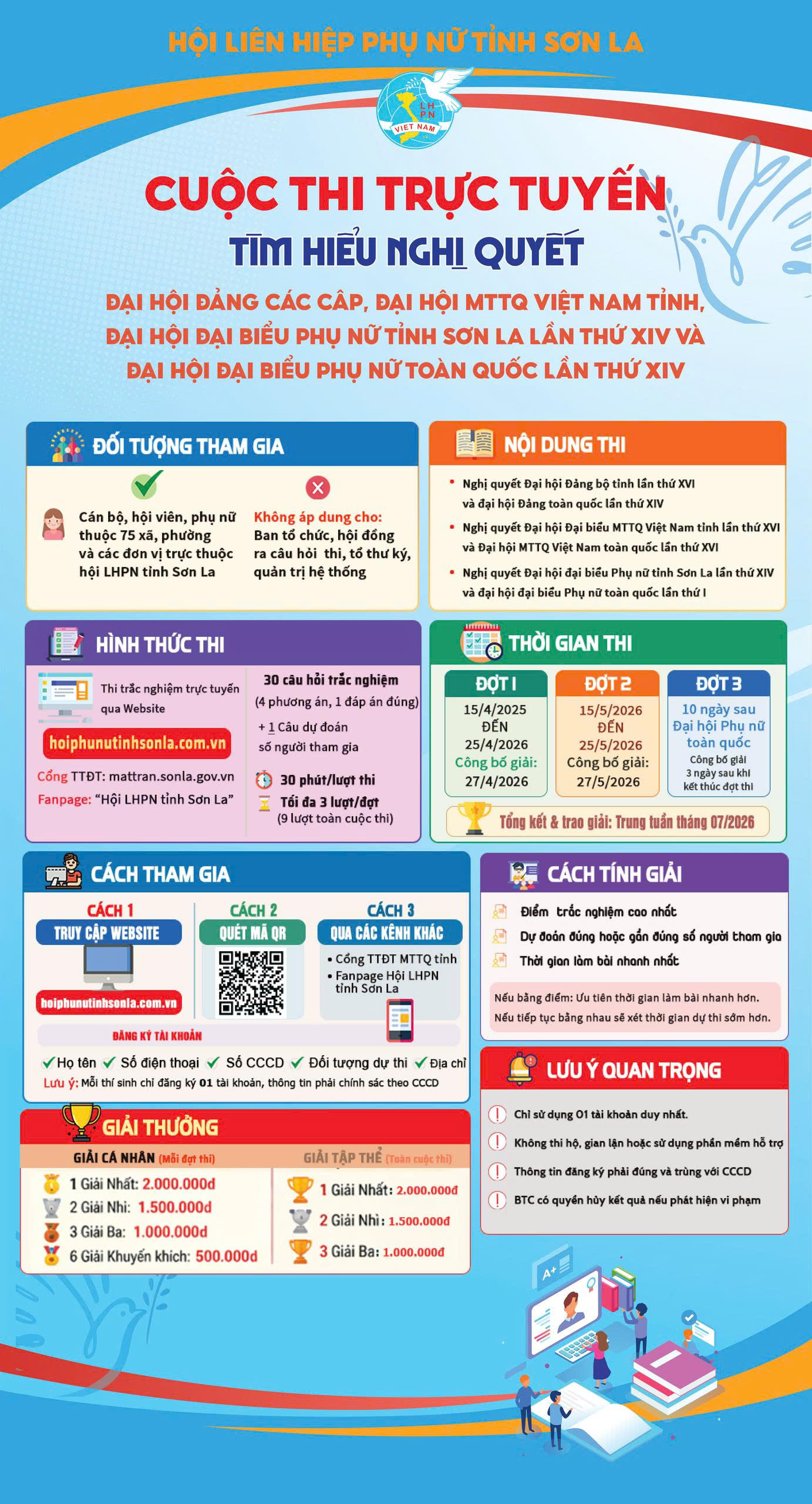 Thể lệ Cuộc thi trực tuyến tìm hiểu Nghị quyết Đại hội Đảng các cấp, Đại hội MTTQ Việt Nam tỉnh, Đại hội đại biểu Phụ nữ tỉnh Sơn La lần thứ XIV và Đại hội đại biểu Phụ nữ toàn quốc lần thứ XIV, nhiệm kỳ 2026 - 2031