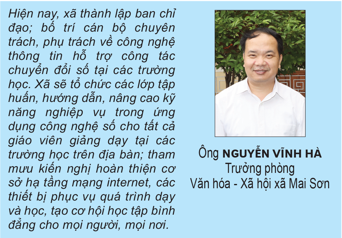 Sau sáp nhập đơn vị hành chính, xã Mai Sơn có 17 trường học từ bậc mầm non đến THPT, với gần 15.000 học sinh. Xã đẩy mạnh tuyên truyền, nâng cao nhận thức của cán bộ, giáo viên, học sinh về sự cần thiết, tính cấp bách của chuyển đổi số. Phát động các phong trào thi đua, thúc đẩy các tập thể, cá nhân phát huy tính chủ động, sáng tạo, trí tuệ, đề xuất sáng kiến, giải pháp hữu ích, góp phần chuyển đổi số trong dạy và học.