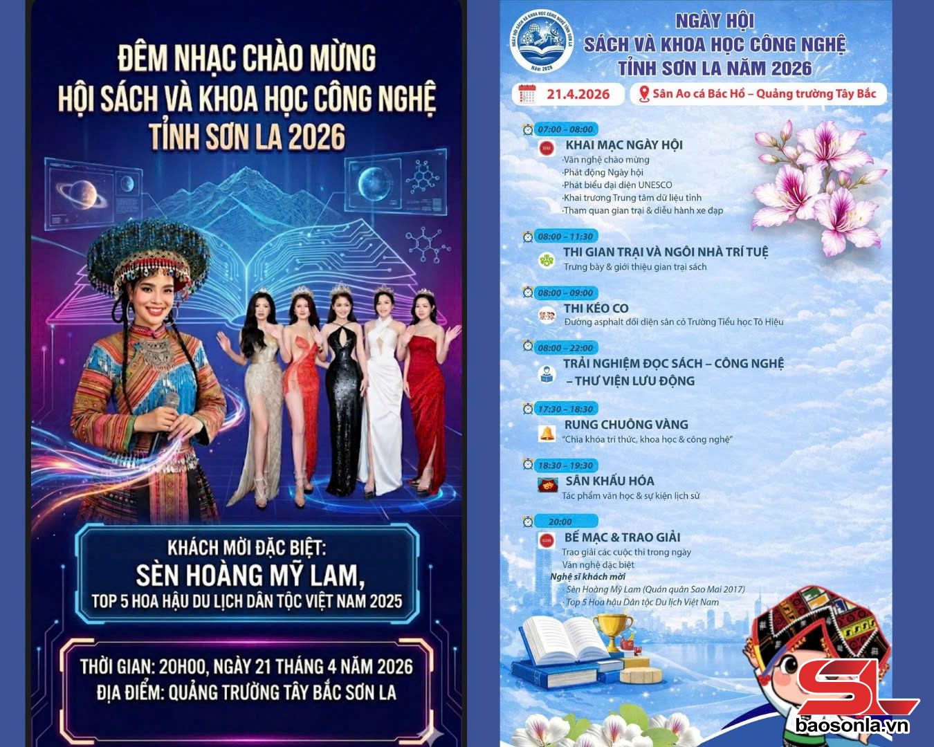 Ngày hội Sách và Khoa học Công nghệ tỉnh Sơn La năm 2026 được tổ chức nhằm thiết thực chào mừng Ngày Sách và Văn hóa đọc Việt Nam (21/4) và Ngày Khoa học, Công nghệ Việt Nam (18/5) và Ngày 21/4 được Liên Hợp Quốc công nhận là Ngày Sáng tạo và Đổi mới sáng tạo thế giới. Ngày hội sẽ diễn ra nhiều hoạt động sôi nổi, hấp dẫn, gồm: Tổ chức không gian đọc sách, trưng bày và giới thiệu gian trại, “Ngôi nhà trí tuệ”, trải nghiệm xe ô tô thư viện lưu động; thi “Chìa khóa tri thức, khoa học và công nghệ” (Rung chuông vàng); thi sân khấu hóa tác phẩm văn học hoặc sự kiện lịch sử; thi kéo co; chương trình nghệ thuật đặc sắc với sự tham gia của ca sĩ nổi tiếng Sèn Hoàng Mỹ Lam…