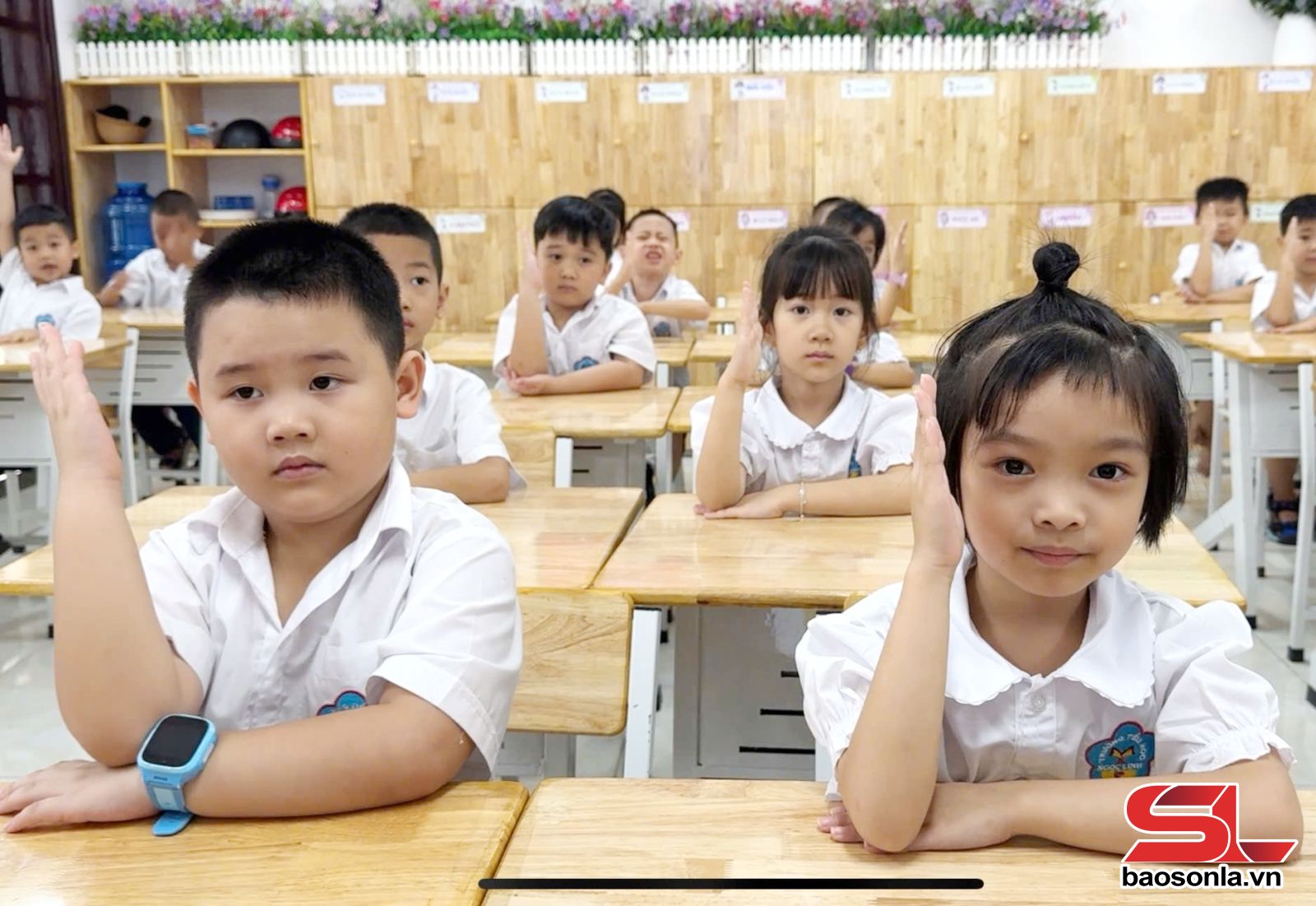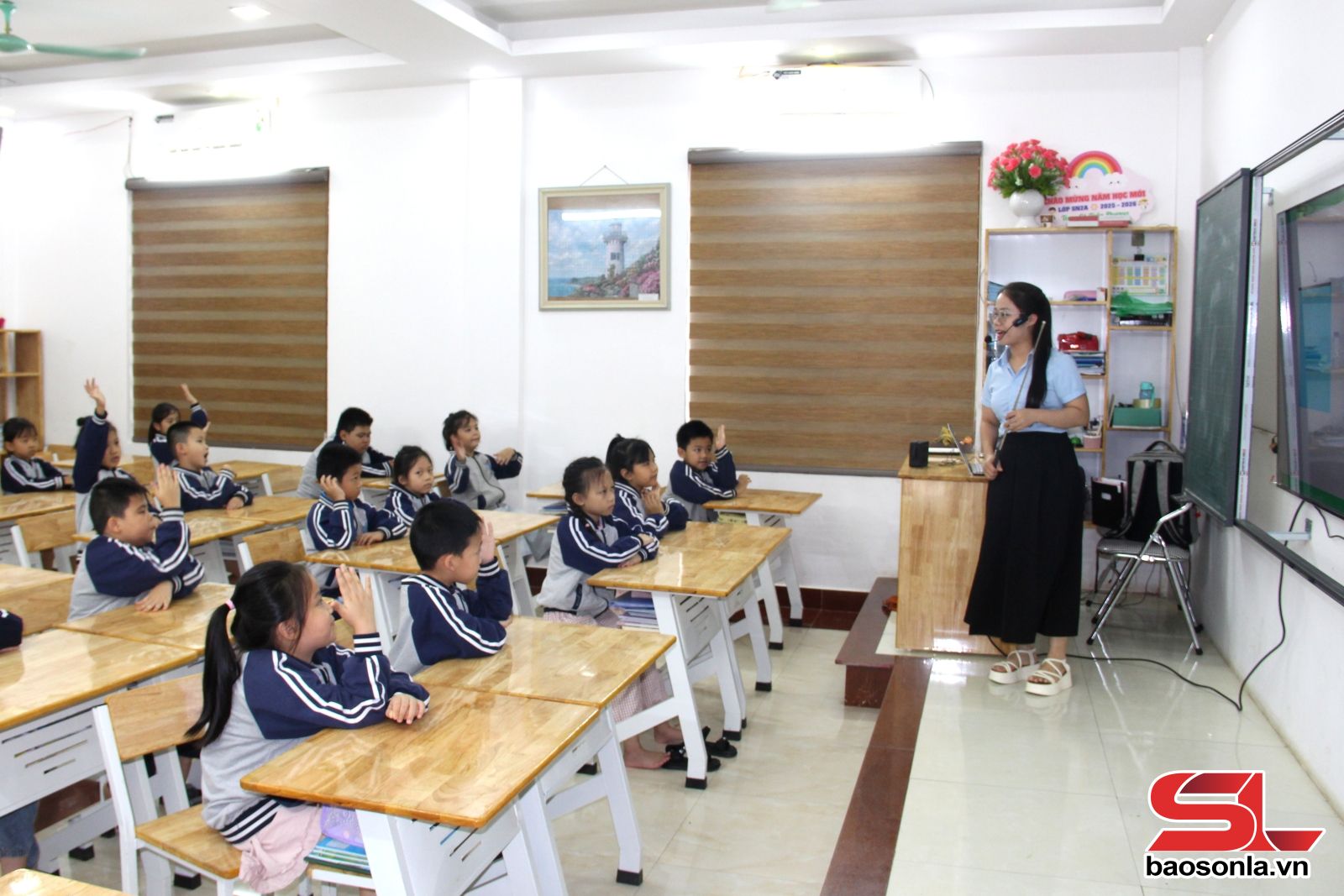 Đưa chúng tôi tham quan các lớp học song ngữ, bà Lê Thị Hà, Hiệu trưởng nhà trường, cho biết: Thực hiện Đề án dạy và học ngoại ngữ trong hệ thống giáo dục quốc dân giai đoạn 2017-2025 của Bộ Giáo dục và Đào tạo, từ tháng 3/2025, nhà trường đã hợp tác với đội ngũ chuyên gia giáo dục song ngữ Bilingual education for Việt Nam (BEV) và Trung tâm Anh ngữ UNI Sơn La triển khai chương trình đưa tiếng Anh trở thành ngôn ngữ thứ hai trong nhà trường. Năm học 2025-2026, trường có 4 lớp song ngữ: 2 lớp khối 1; 1 lớp khối 2 và 1 lớp khối 3 với gần 120 học sinh.