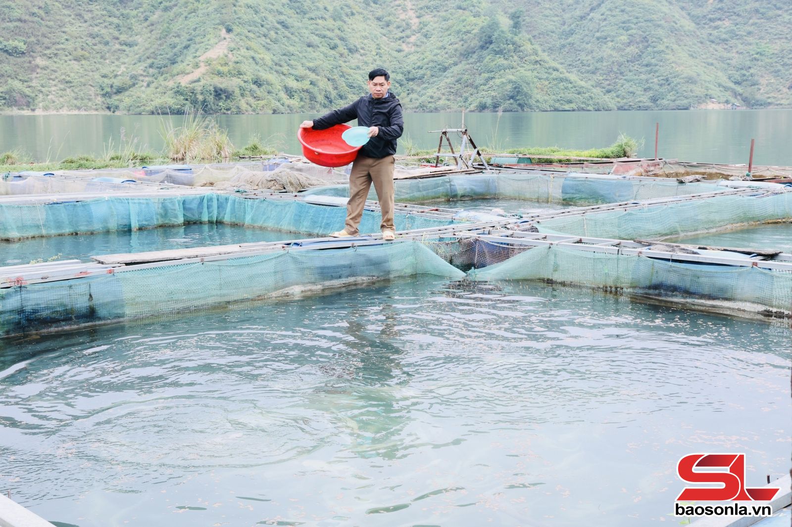 Cách khu nuôi cá nhà ông Quàng Văn Tưởng không xa, là khu nuôi 44 lồng đang nuôi cá của gia đình ông Quàng Văn Linh. Riêng năm 2025, gia đình ông đã bán được 8 tấn cá, chủ yếu là cá lăng vàng, lăng đen, cá nheo, rô phi. Dự kiến, từ nay đến trước Tết Nguyên đán, gia đình ông sẽ tiếp tục thu hoạch và bán hơn 20 tấn cá các loại, trừ chi phí thu lãi gần 300 triệu đồng. Ông Linh cho biết: Nuôi cá lồng trên lòng hồ ít dịch bệnh, cá lớn nhanh, thức ăn chủ yếu là sắn, ngô và cỏ. Ngoài ra, các hộ nuôi cá lồng còn thu mua cá tép do các hộ đánh bắt để làm thức ăn cho cá, tạo thêm thu nhập cho bà con.