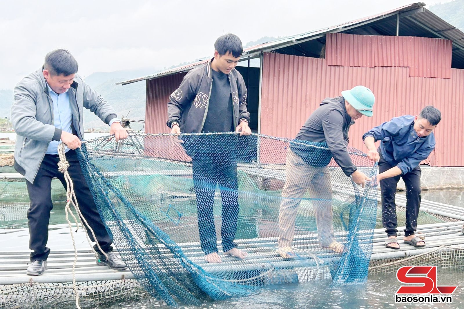 Từ trung tâm xã Mường Khiêng, vượt qua những con dốc quanh co, chúng tôi đến bản Ban Xa, trên vùng lòng hồ mênh mông là những dãy lồng bè nuôi cá nổi trên mặt nước. Thăm mô hình nuôi cá lồng của gia đình ông Quàng Văn Tưởng, Bí thư Chi bộ, Trưởng bản, một trong những hộ tiêu biểu của xã làm giàu từ nuôi cá lồng. Ông Tưởng chia sẻ: Bản có 84 hộ đều là dân tộc La Ha, trong đó, có 10 hộ nuôi 110 lồng cá trên lòng hồ thủy điện, mang lại hiệu quả kinh tế cao. Riêng gia đình tôi, năm 2017 đã đầu tư nuôi 10 lồng cá, thấy hiệu quả, tiếp tục mở rộng quy mô lên 21 lồng; trong đó, 18 lồng nuôi cá lăng vàng; còn lại là nuôi cá trắm đen, cá rô, cá trắm cỏ. Năm 2025, gia đình đã bán được hơn 5 tấn cá lăng vàng. Hiện còn khoảng hơn 20 tấn cá các loại, dự kiến sẽ bán trong dịp Tết Nguyên đán, sau khi trừ chi phí, cho thu lãi gần 800 triệu đồng.