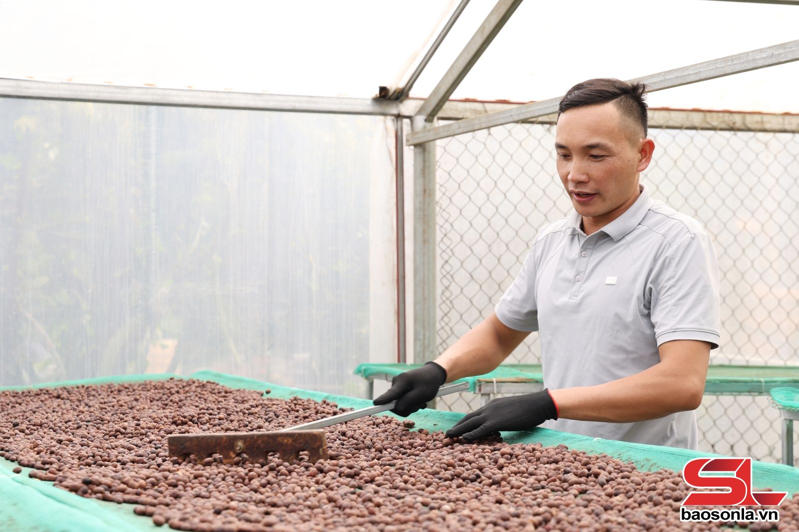 HTX Sàng Nà Tre, xã Chiềng Mai mới thành lập năm 2023 nhưng nhanh chóng tạo dấu ấn nhờ hướng làm cà phê hữu cơ. Các hộ thành viên thu hái đảm bảo quả chín đạt 99,9%. Cà phê được phơi 18 - 22 ngày, có thể kéo dài đến 30 ngày nếu thời tiết không thuận lợi. Anh Cầm Văn Hoàng, Giám đốc HTX, cho biết: Chế biến Natural rất vất vả vì từng mẻ phải đo pH, kiểm soát độ ẩm mỗi ngày nhưng giá trị sản phẩm cao gấp 3 - 4 lần cà phê thường. Năm 2024, HTX bán hơn 1 tấn Natural với giá 700.000 đồng/kg, trong đó 97% được xuất khẩu. Năm nay, HTX đặt mục tiêu sản xuất trên 10 tấn.