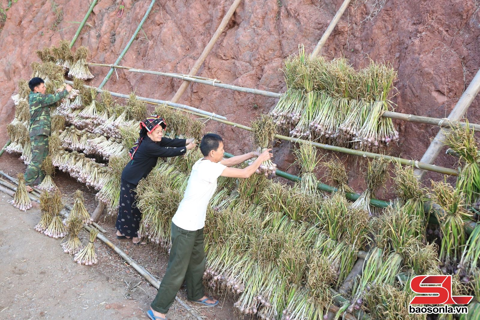 Không chỉ nhộn nhịp ngoài đồng, không khí thu hoạch còn lan tỏa tới từng sân nhà. Tại bản Đông Tấu, hầu hết các hộ dân đều tận dụng khoảng trống trước hiên, sân vườn để phơi tỏi. Tỏi sau khi nhổ được cắt rễ, tỉa lá, phân loại rồi trải đều dưới nắng. Nhiều gia đình buộc tỏi thành từng chùm, treo lên các giàn tre cao dựng trước sân để vỏ khô dần, giữ màu sắc đẹp.