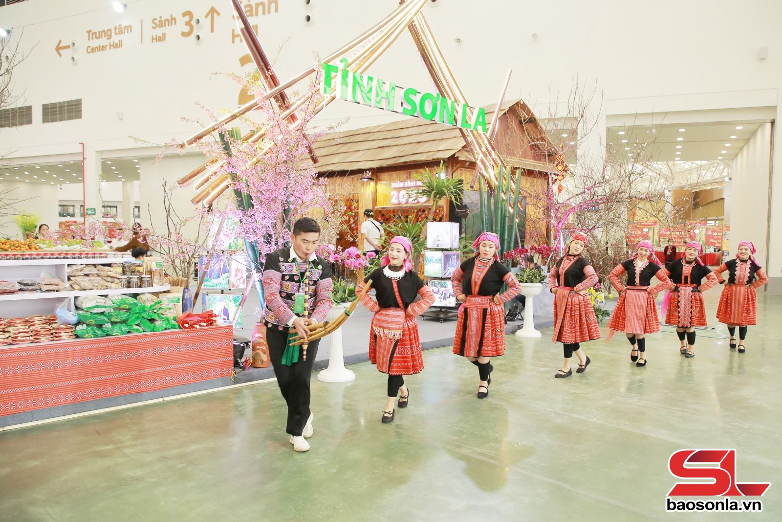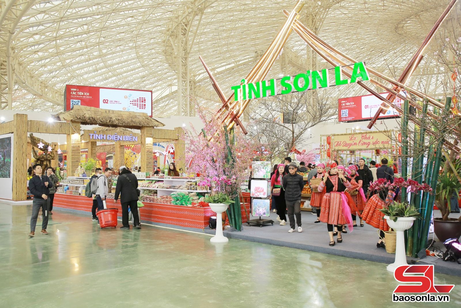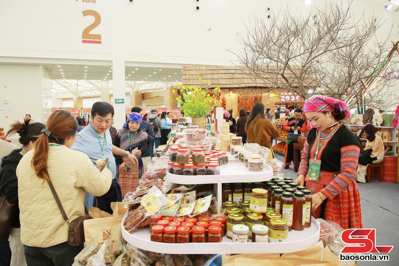 Giữa 3.000 gian hàng sôi động, gian trưng bày của tỉnh Sơn La nổi bật như một bức tranh sống động mang dấu ấn vùng núi Tây Bắc. Gian hàng rộng hơn 200 m², được thiết kế theo không gian văn hóa đồng bào dân tộc Mông, tạo điểm nhấn bằng sắc hoa mận, hoa cải và hoa mai anh đào, giúp du khách tham quan, mua sắm tại gian hàng có thể sống trong không khí mùa xuân Tây Bắc. Những ấn phẩm, hình ảnh, video giới thiệu các danh lam thắng cảnh, lễ hội truyền thống của Sơn La được lồng ghép khéo léo, biến gian hàng thành điểm thông tin du lịch hấp dẫn.