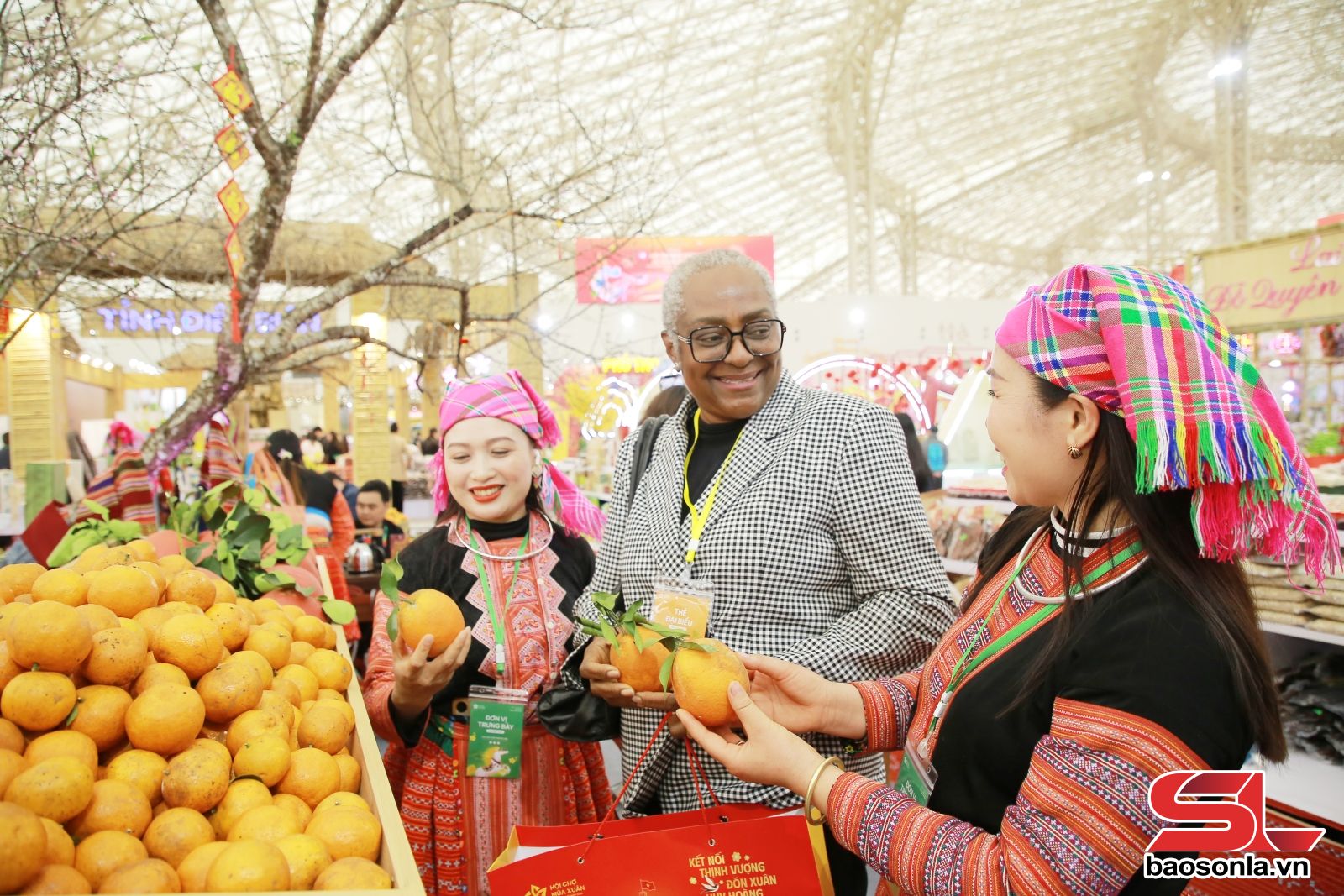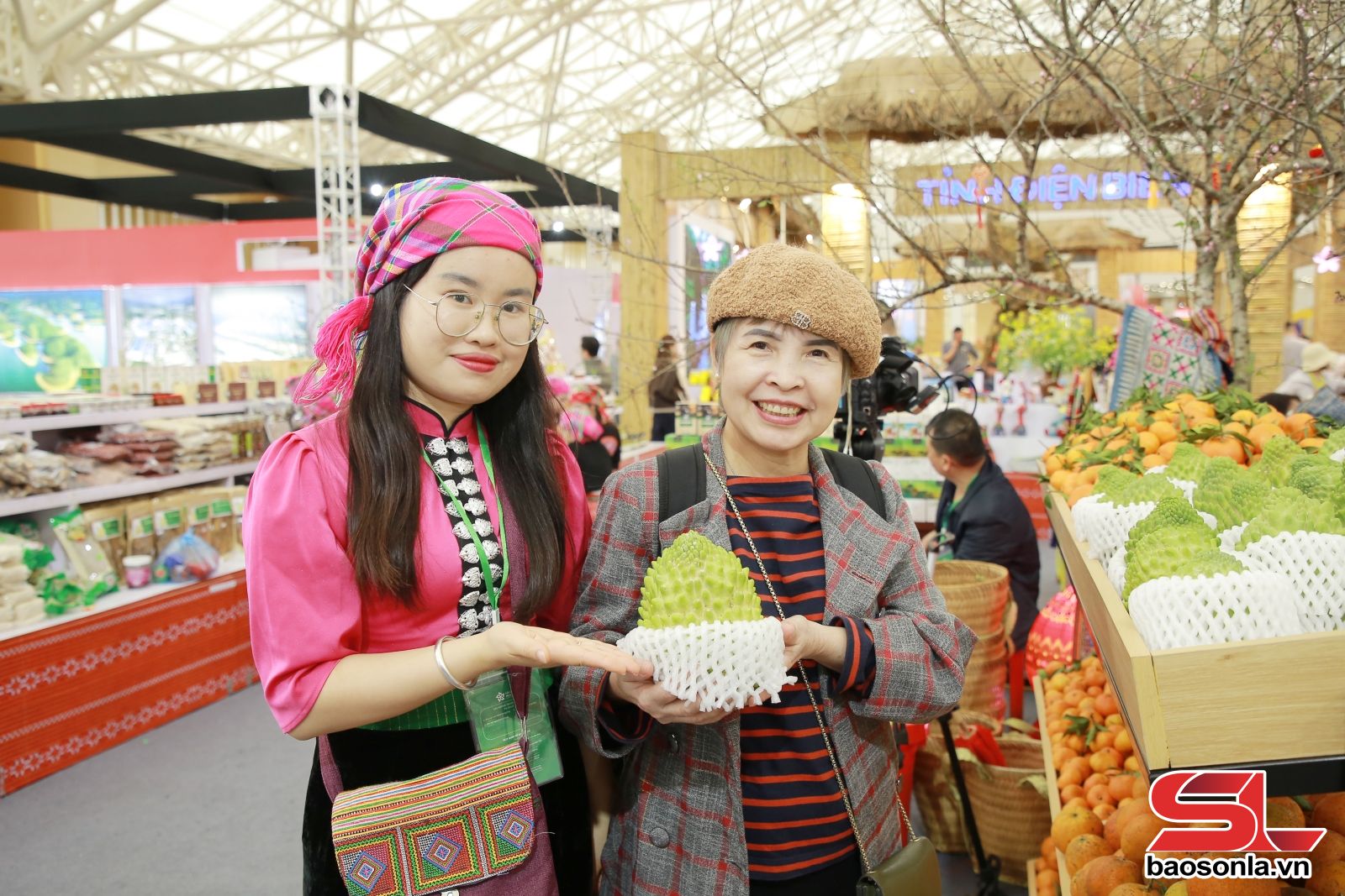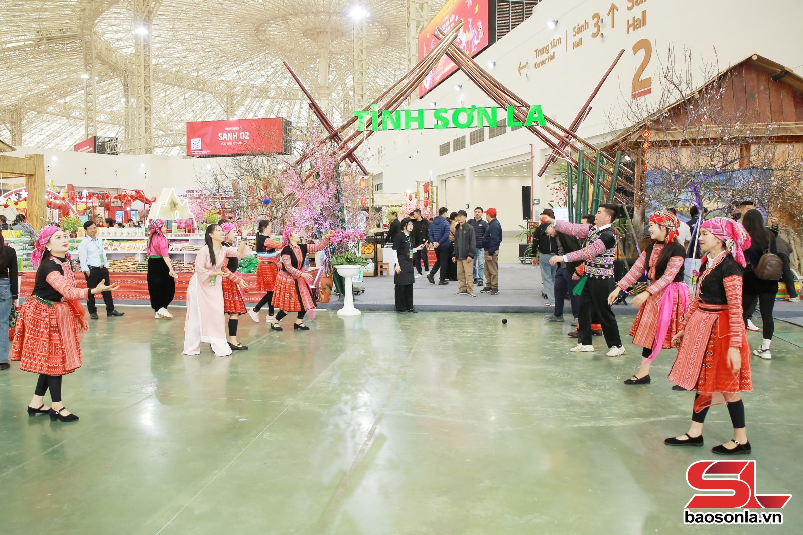 Giữa 3.000 gian hàng sôi động, gian trưng bày của tỉnh Sơn La nổi bật như một bức tranh sống động mang dấu ấn vùng núi Tây Bắc. Gian hàng rộng hơn 200 m², được thiết kế theo không gian văn hóa đồng bào dân tộc Mông, tạo điểm nhấn bằng sắc hoa mận, hoa cải và hoa mai anh đào, giúp du khách tham quan, mua sắm tại gian hàng có thể sống trong không khí mùa xuân Tây Bắc. Những ấn phẩm, hình ảnh, video giới thiệu các danh lam thắng cảnh, lễ hội truyền thống của Sơn La được lồng ghép khéo léo, biến gian hàng thành điểm thông tin du lịch hấp dẫn.