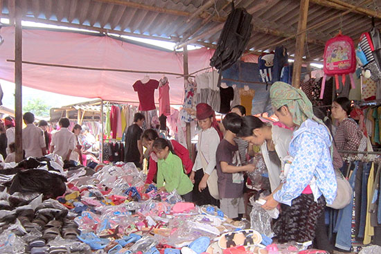 Chợ phiên Bình Thuận, xã Phổng Lái (Thuận Châu) phục vụ nhu cầu mua sắm của nhân dân. Ảnh Nguyễn Thảo