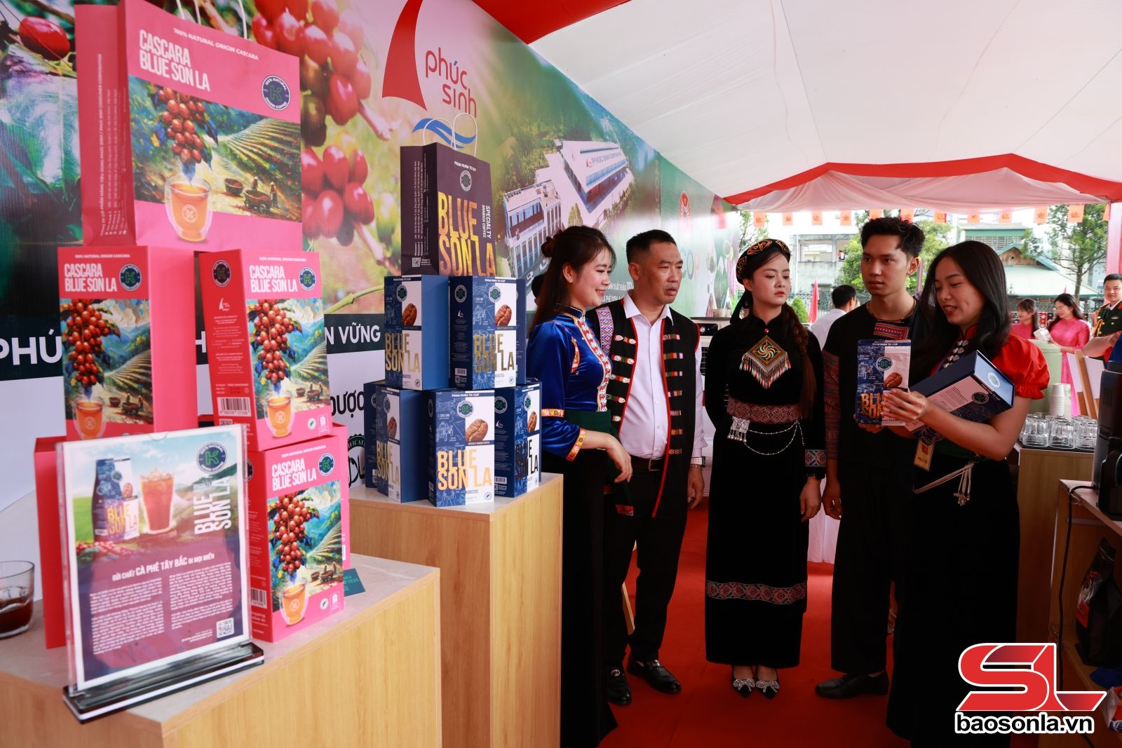 Khách hàng tham quan gian hàng trưng bày sản phẩm cà phê và trà Cascara của Công ty CP Phúc Sinh Sơn La.