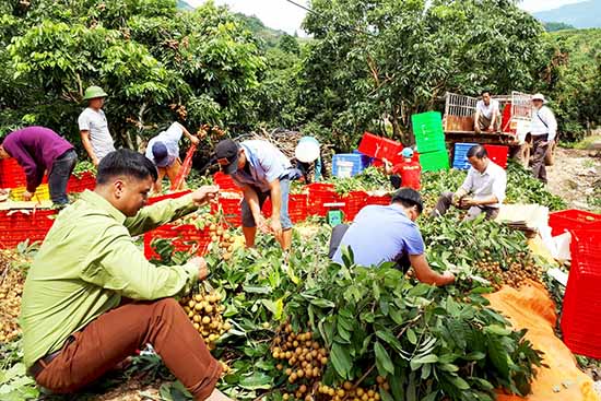 Các thành viên HTX Cây ăn quả, chăn nuôi Phương Nam, bản Pha Cúng, xã Lóng Phiêng (Yên Châu) thu hoạch nhãn xuất khẩu sang Mỹ.