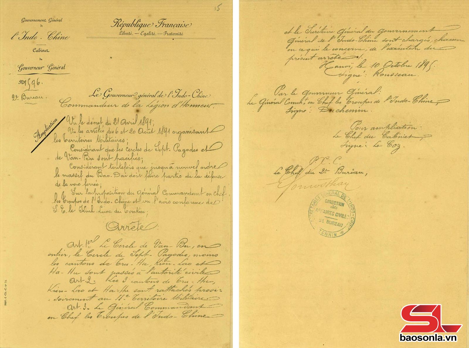 Nghị định số 996 ngày 10/10/1895 của Toàn quyền Đông Dương về việc toàn bộ tỉnh Vạn Bú và tỉnh Phả Lại trừ các tổng Tru-hu, Kiên-lao à Ha-hu được chuyển sang chính quyền dân sự. Nguồn: Trung tâm Lưu trữ lịch sử tỉnh