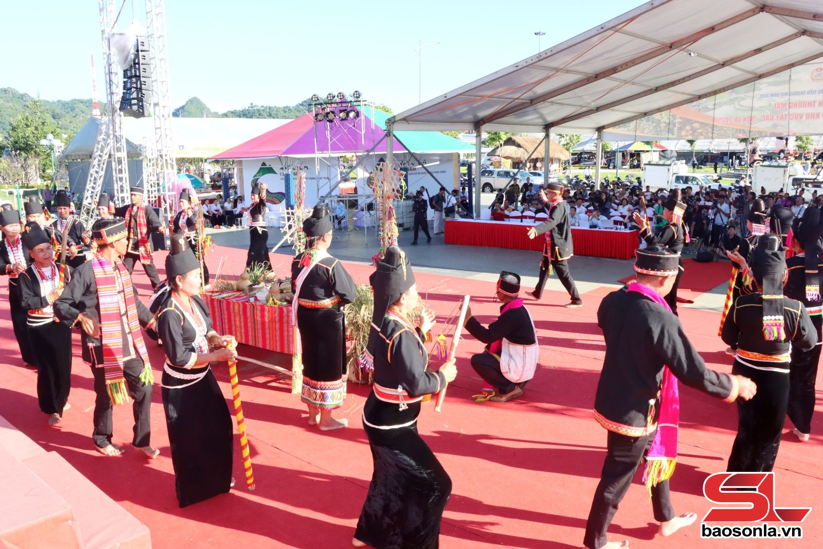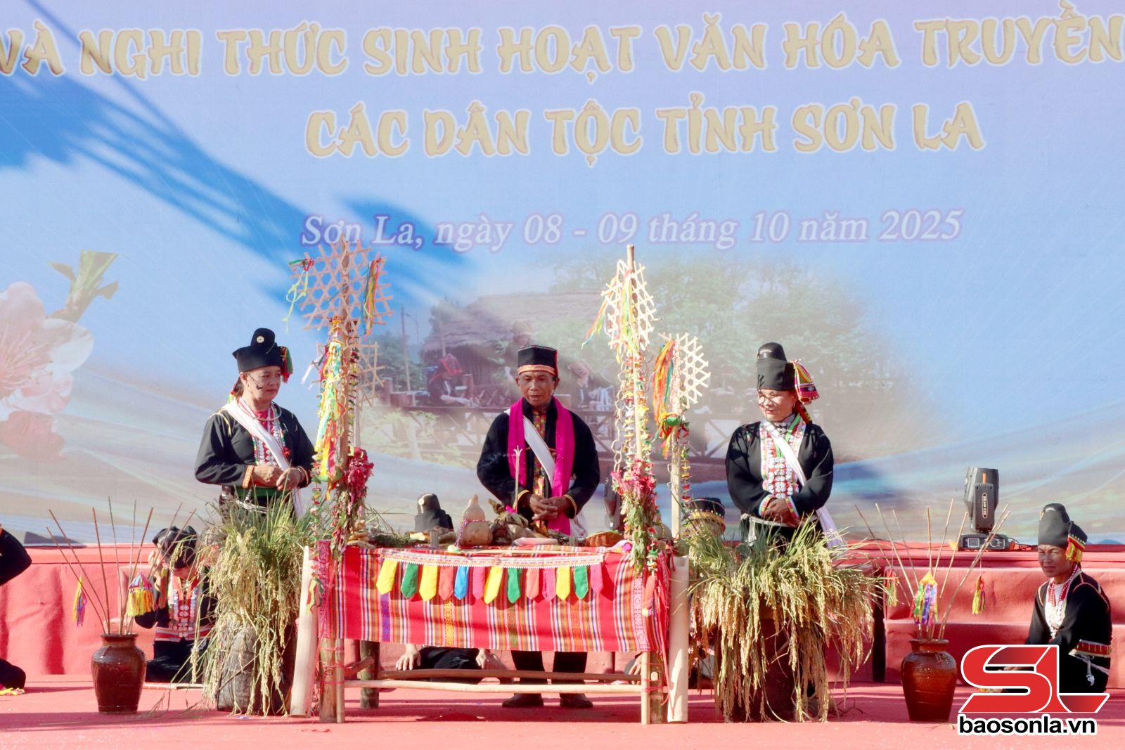 Chiều 9/10, các nghệ nhân, diễn viên quần chúng xã Thuận Châu đã trình diễn trích đoạn Lễ hội Cúng mừng lúa mới của dân tộc Khơ Mú.
