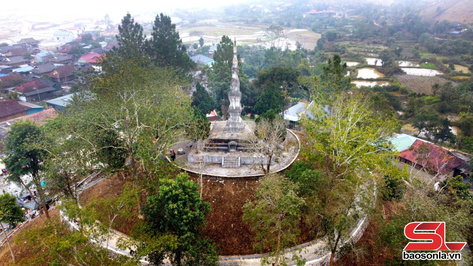 Theo truyền thuyết truyền lại cách đây hơn 400 năm có một thầy địa lý người Hoa đi qua vùng đất này thấy có cảnh đẹp, theo thuyết phong thuỷ thì là một vùng đất đẹp và ổn định. Ông đã bàn với Chẩu Hua (người đứng đầu trong vùng) để xây dựng chùa và tháp, để làm nơi nhân dân đến lễ phật, nghe kinh, tổ chức lễ hội. Chẩu Hua đã huy động nhân dân trong vùng khởi khởi công đắp quả đồi ngay tại trung tâm của bản. Đất đáp đồi được lấy từ 2 bên và đằng sau tháp, trước đây xung quang tháp còn có 3 chiếc hồ lớn. Sau khi đắp hồ song, Chẩu Hua cho xây tháp và dựng chùa để người dân đến lễ phật, nghe kinh, chùa còn là nơi tập hợp toàn dân vào những ngày hội lớn, nhỏ của bản.