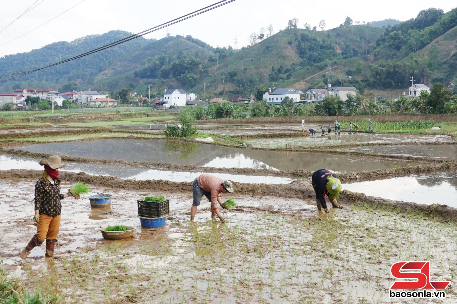 Tại xã Mường Chanh, bà con xuống giống đồng loạt khi thời tiết ấm lên. Năm nay, phương pháp canh tác lúa cải tiến SRI tiếp tục được nông dân áp dụng. Các nguyên tắc chính bao gồm cấy mạ non (10-15 ngày), cấy thưa (1 dảnh/khóm), đảm bảo đủ nước, bón nhiều phân hữu cơ và làm cỏ sục bùn được bà con áp dụng phổ biến. Trên cánh đồng bản Đen, ông Lò Văn Tiếp tranh thủ thuê thêm 6 nhân công để cấy 2.000 m² lúa cho kịp tiến độ. Ông Tiếp chia sẻ: Gia đình tôi chuẩn bị mạ từ trước Tết. Khi thời tiết thuận lợi là xuống đồng ngay. Thuê thêm nhân công để hoàn thành sớm, tránh gặp rét hoặc khô hạn cuối vụ. Cấy xong sớm cũng yên tâm chăm sóc.