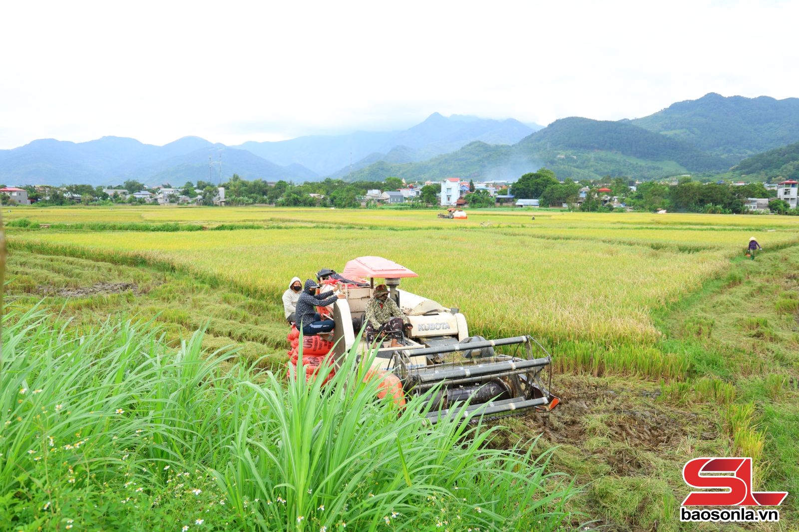 Trên cánh đồng tiểu khu Búc, vùng trồng lúa lớn nhất ở Phù Yên, không khí thu hoạch diễn ra sôi động. Bà con nông dân huy động tối đa các phương tiện, nhân công khẩn trương thu hoạch lúa mùa với phương châm “xanh nhà hơn già đồng”. Bà Đinh Thị Hạnh, tiểu khu Búc, chia sẻ: Gia đình tôi cấy hơn 2.000 m² lúa giống J02, tranh thủ thời tiết nắng ráo, tôi thuê đội máy gặt đập liên hợp để thu hoạch lúa, với giá thuê 600.000 đồng/1.000 m2 ruộng. Máy vừa gặt, tuốt, sàng sẩy, đóng bao luôn nên tiết kiệm được thời gian, chi phí.