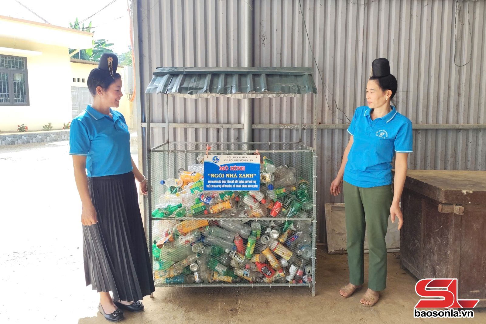 Đến bản Lụa, phường Chiềng Cơi, dễ nhận thấy những mô hình “Ngôi nhà xanh” của chi hội phụ nữ bản được đặt tại nhà văn hóa hay khu vực công cộng. Chị Tòng Thị Nhung, Chi hội trưởng Chi hội phụ nữ bản Lụa, chia sẻ: “Ngôi nhà xanh” được thiết kế bằng khung sắt, có mái che bằng tôn, xung quanh quây lưới; diện tích trung bình từ 1 - 2m², được đặt ở vị trí phù hợp, thuận lợi cho nhân dân bỏ rác tái chế. Đây là mô hình nhằm thu gom, phân loại rác thải nhựa và gây quỹ từ bán rác thải tái chế để thăm hỏi hội viên phụ nữ khó khăn. Mô hình nhận được sự hưởng ứng tích cực của các hội viên, xây dựng thói quen phân loại rác thải hữu cơ và vô cơ tại gia đình.