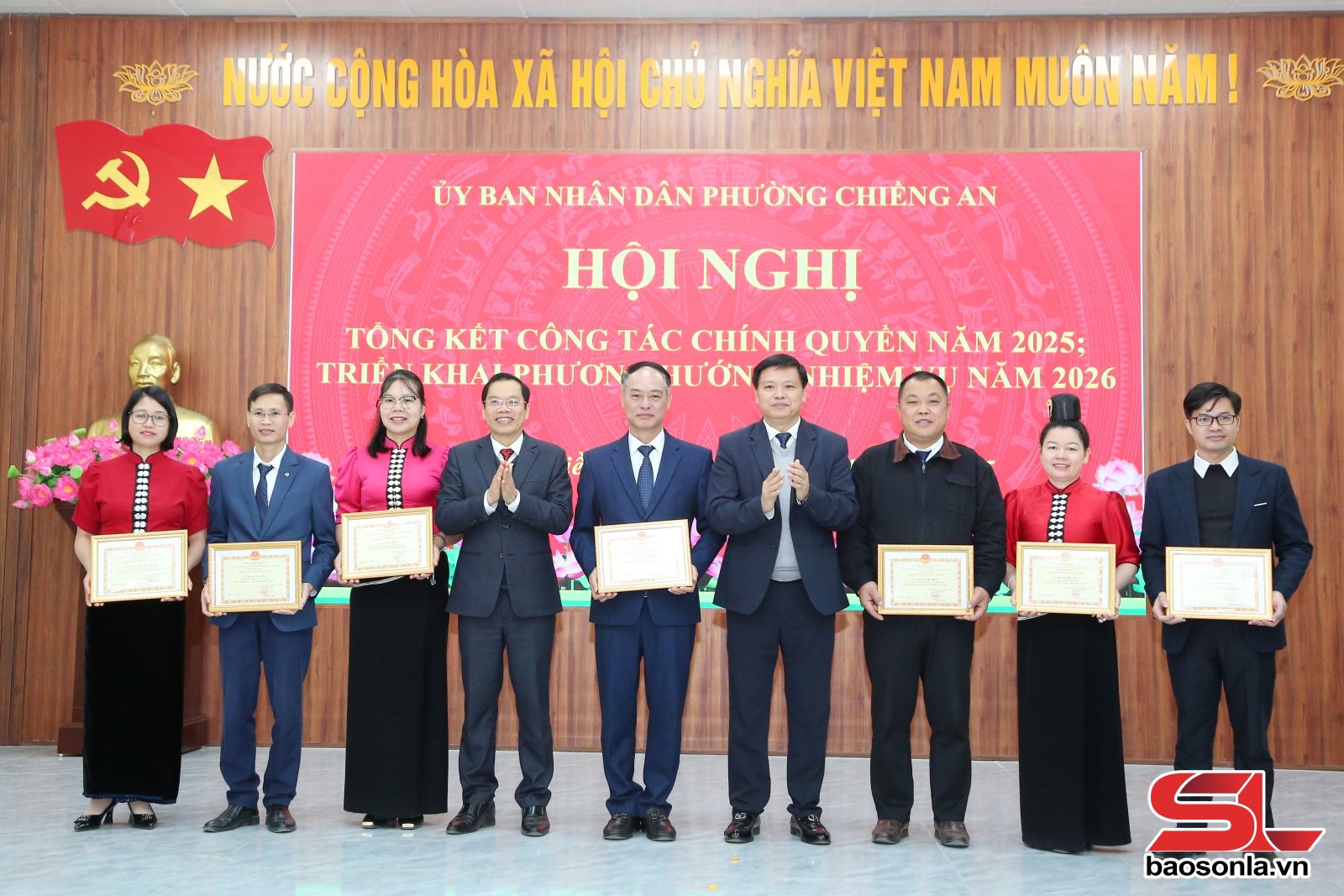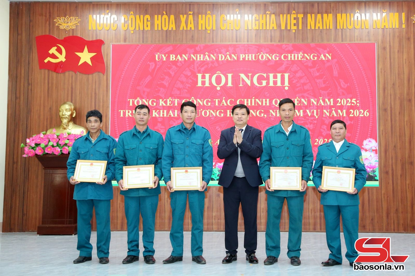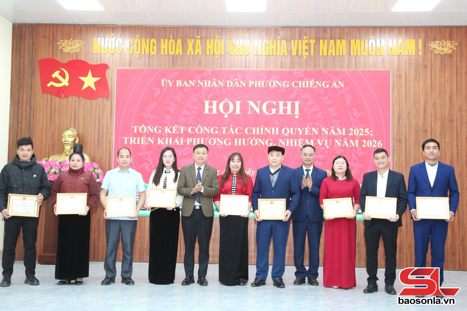 Nhân dịp này, phường Chiềng An trao Danh hiệu “Tập thể lao động tiên tiến” cho 8 tập thể, “Chiến sĩ thi đua cơ sở” cho 17 cá nhân và “Lao động tiên tiến” cho 73 cá nhân; Chủ tịch UBND phường Chiềng An đã tặng Giấy khen 14 tập thể, 35 cá nhân có thành tích xuất sắc trong thực hiện nhiệm vụ năm 2025. Tặng giấy khen 5 tập thể, 6 cá nhân có thành tích trong công tác quân sự, quốc phòng địa phương năm 2025.