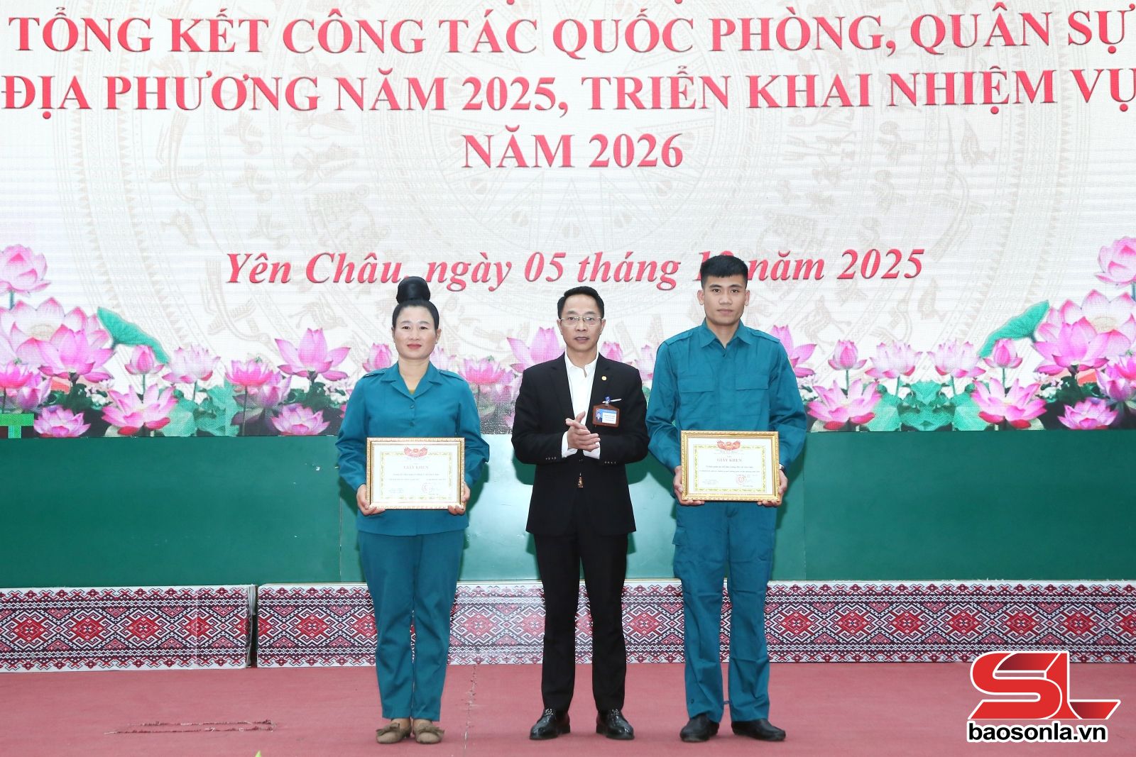 Nhận dịp này, Chủ tịch UBND xã Yên Châu tặng giấy khen 2 tập thể, 8 cá nhân đã có thành tích xuất sắc trong công tác quốc phòng, quân sự năm 2025.