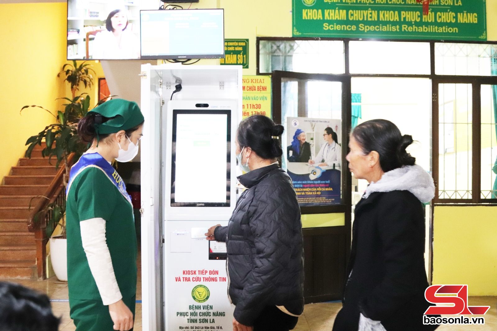 Tại Khoa Khám chuyên khoa phục hồi chức năng, ngay từ đầu giờ sáng, nhân viên y tế của Bệnh viện có mặt hướng dẫn nhân dân sử dụng căn cước công dân quét Kios thông minh tại khu vực tiếp đón để đăng ký khám bệnh.