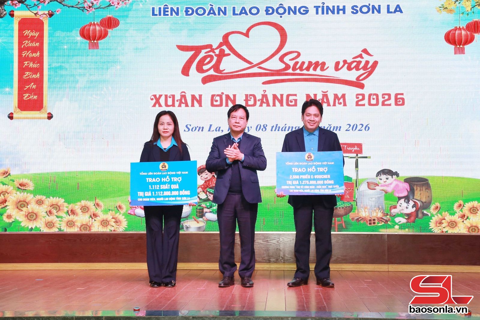 Tại chương trình, Tổng Liên đoàn Lao động Việt Nam đã tặng 2.550 e-voucher trị giá hơn 1,2 tỷ đồng trong chương trình “Chợ Tết Công đoàn - Xuân 2026”; 1.112 suất quà trị giá hơn 1,1 tỷ đồng cho Liên đoàn Lao động tỉnh. Tổng Liên đoàn Lao động Việt Nam và Liên đoàn Lao động tỉnh trao 80 suất quà Tết cho đoàn viên, người lao động khu vực Mộc Châu, Vân Hồ có hoàn cảnh khó khăn, bệnh hiểm nghèo.