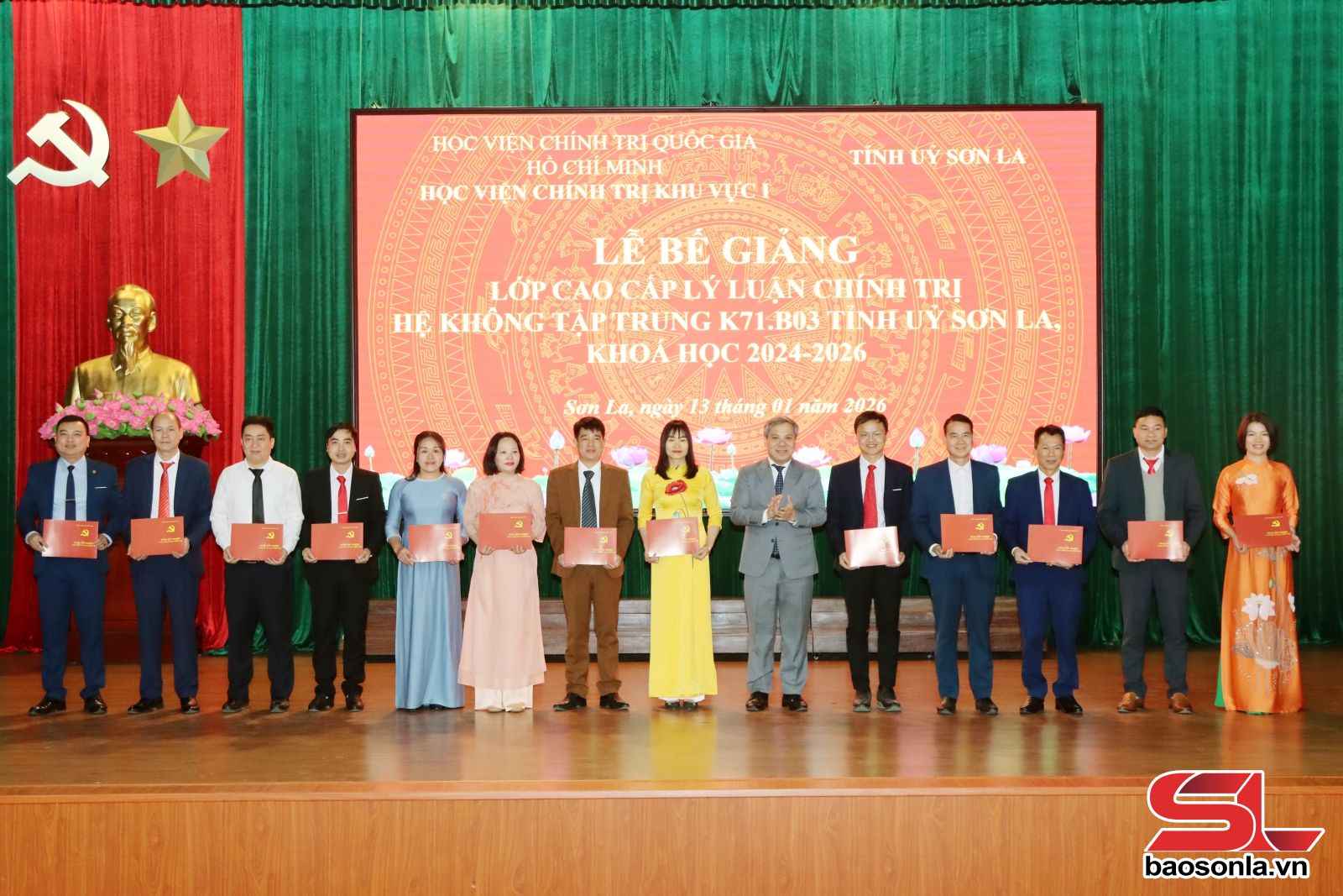 Ngày 13/1, Học viện Chính trị khu vực I đã phối hợp với Tỉnh ủy Sơn La tổ chức Lễ bế giảng Lớp cao cấp lý luận chính trị hệ không tập trung K71.B03 Tỉnh ủy Sơn La, khóa học 2024-2026. Dự Lễ bế giảng có Tiến sĩ Vũ Văn Hậu, Phó Giám đốc Học viện Chính trị khu vực I; lãnh đạo Ban Tổ chức Tỉnh ủy, Trường Chính trị tỉnh, các học viên tham gia lớp học.