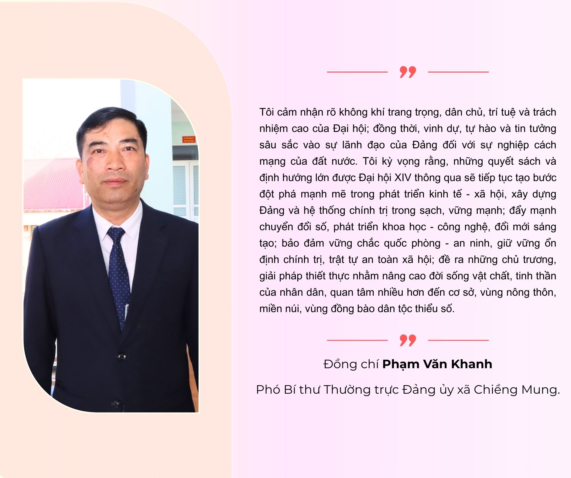 Mặc dù 8 giờ ngày 20/1 mới diễn ra Phiên Khai mạc đại hội, nhưng từ hơn 7 giờ sáng, các đồng chí cán bộ, đảng viên của phường Chiềng An đã có mặt đông đủ tại tại Nhà văn hóa phường với trang phục đẹp nhất, trọng nhất để cùng theo dõi truyền hình trực tiếp phiên Khai mạc Đại hội đại biểu toàn quốc lần thứ XIV của Đảng trên sóng của Đài Truyền hình Việt Nam. Cán bộ, đảng viên và Nhân dân các dân tộc phường Chiềng An đều bày tỏ niềm vui, sự phấn khởi và sự tin tưởng tuyệt đối vào sự thành công của Đại hội và sự lãnh đạo của Đảng.
