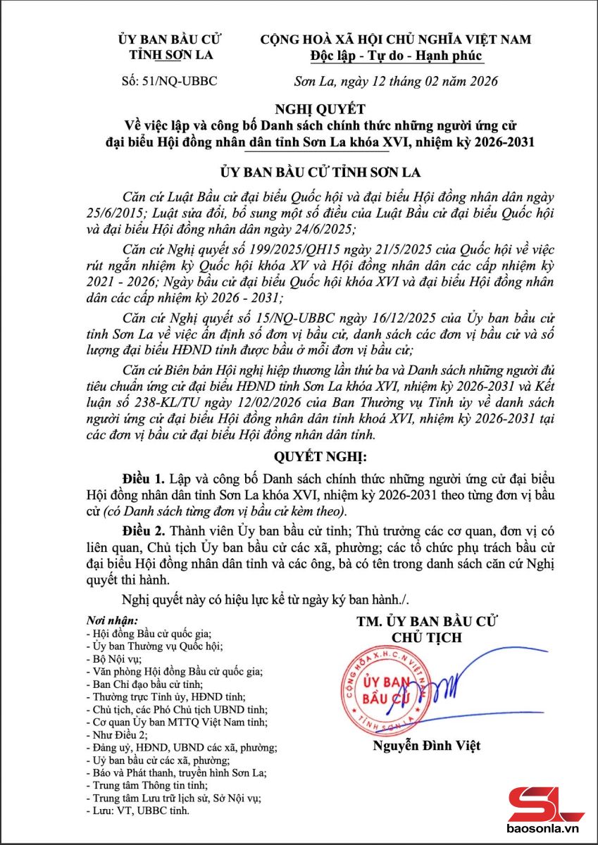 Ủy ban bầu cử tỉnh Sơn La vừa ban hành Nghị quyết số 51/NQ-UBBC về việc lập và công bố danh sách chính thức những người ứng cử đại biểu Hội đồng nhân dân (HĐND) tỉnh khóa XVI, nhiệm kỳ 2026–2031.