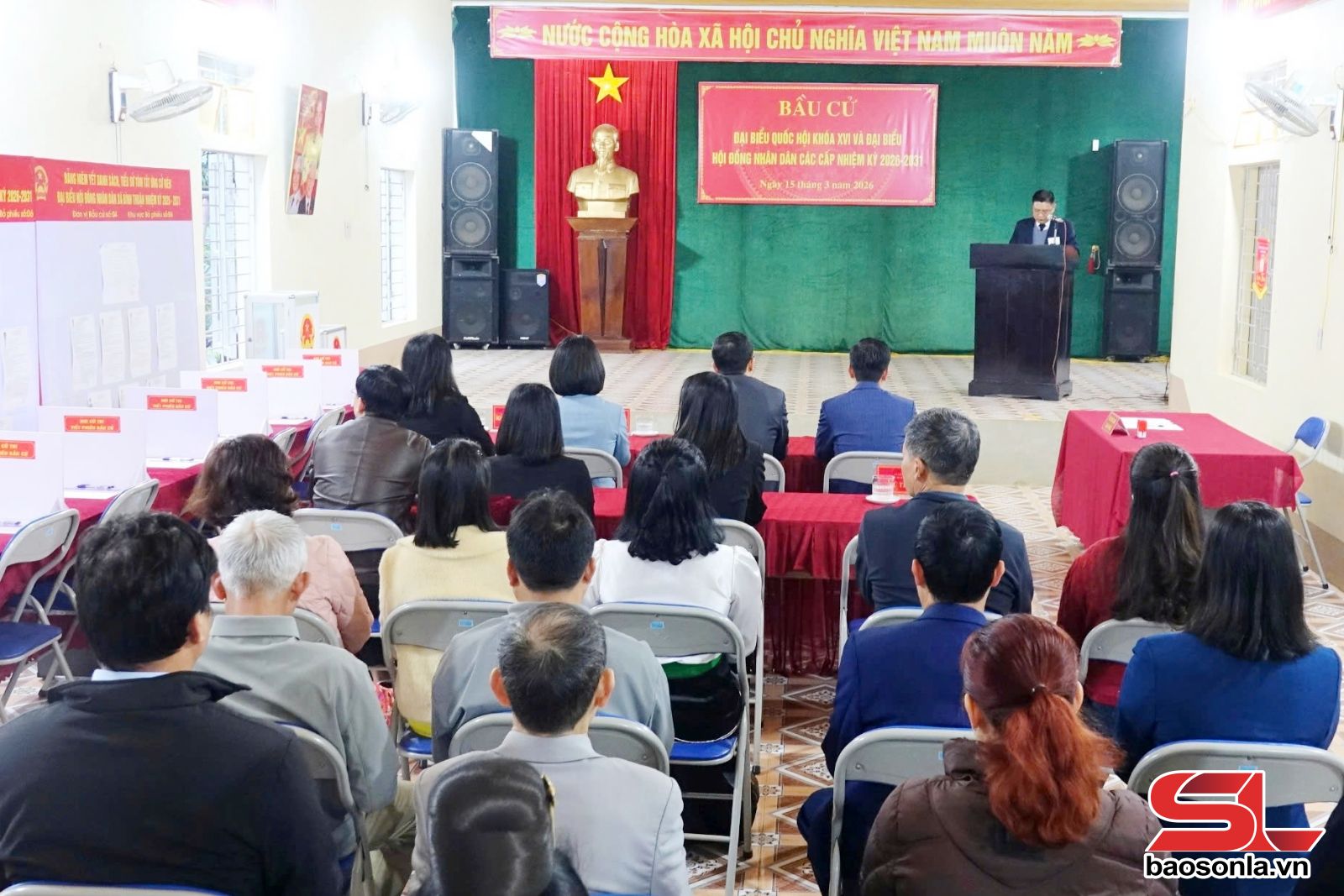 Sau lễ chào cờ cử tri được nghe nội quy phòng bỏ phiếu và chứng kiến việc kiểm tra, niêm phong hòm phiếu theo đúng quy định của Luật Bầu cử.