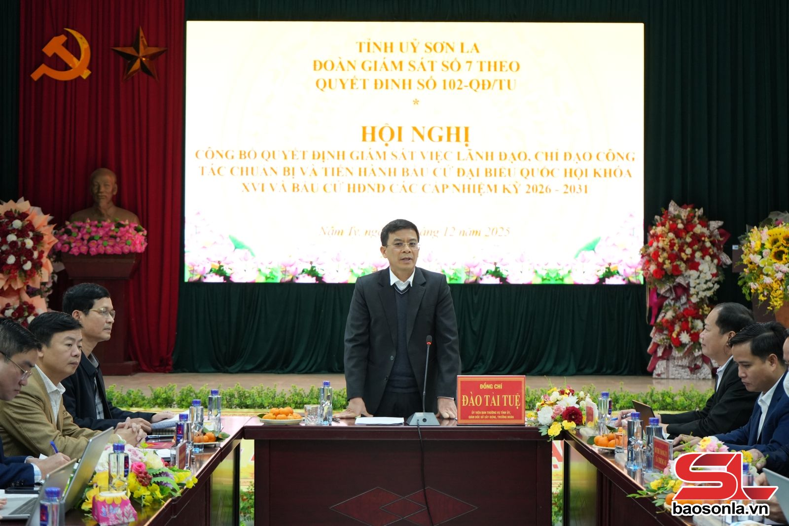 Ngày 28/12, Đoàn Giám sát số 7 của Ban Thường vụ Tỉnh ủy Sơn La do đồng chí Đào Tài Tuệ, Ủy viên Ban Thường vụ Tỉnh ủy, Giám đốc Sở Xây dựng làm Trưởng đoàn, đã làm việc với Ban Thường vụ Đảng ủy các xã: Bình Thuận, Mường É, Mường Khiêng, Chiềng La, Muổi Nọi, Chiềng Khoong, Mường Lầm, Nậm Ty và Chiềng Sơ để công bố các nội dung giám sát về công tác lãnh đạo, chỉ đạo chuẩn bị và tiến hành bầu cử đại biểu Quốc hội khóa XVI và bầu cử đại biểu Hội đồng nhân dân các cấp, nhiệm kỳ 2026–2031.