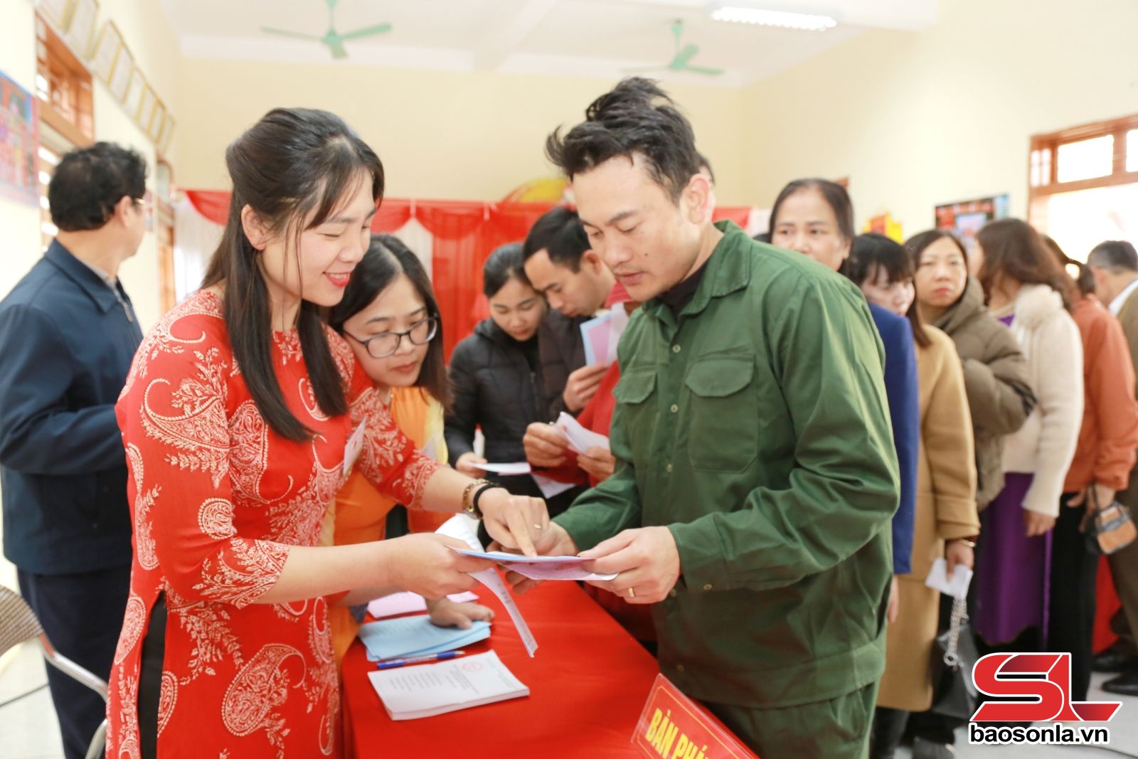 Ngay từ sáng sớm, bà con nhân dân trong những bộ trang phục đẹp nhất, rực rỡ nhất đã tề tựu về đây, gương mặt ai nấy đều rạng rỡ niềm tự hào của người dân vùng tâm điểm du lịch và sản xuất chè nổi tiếng mang thương hiệu Mộc Châu. Cờ đỏ, băng rôn, khẩu hiệu được trang hoàng rực rỡ khắp khu vực bỏ phiếu, tạo nên một không khí vừa trang nghiêm, vừa tươi vui.